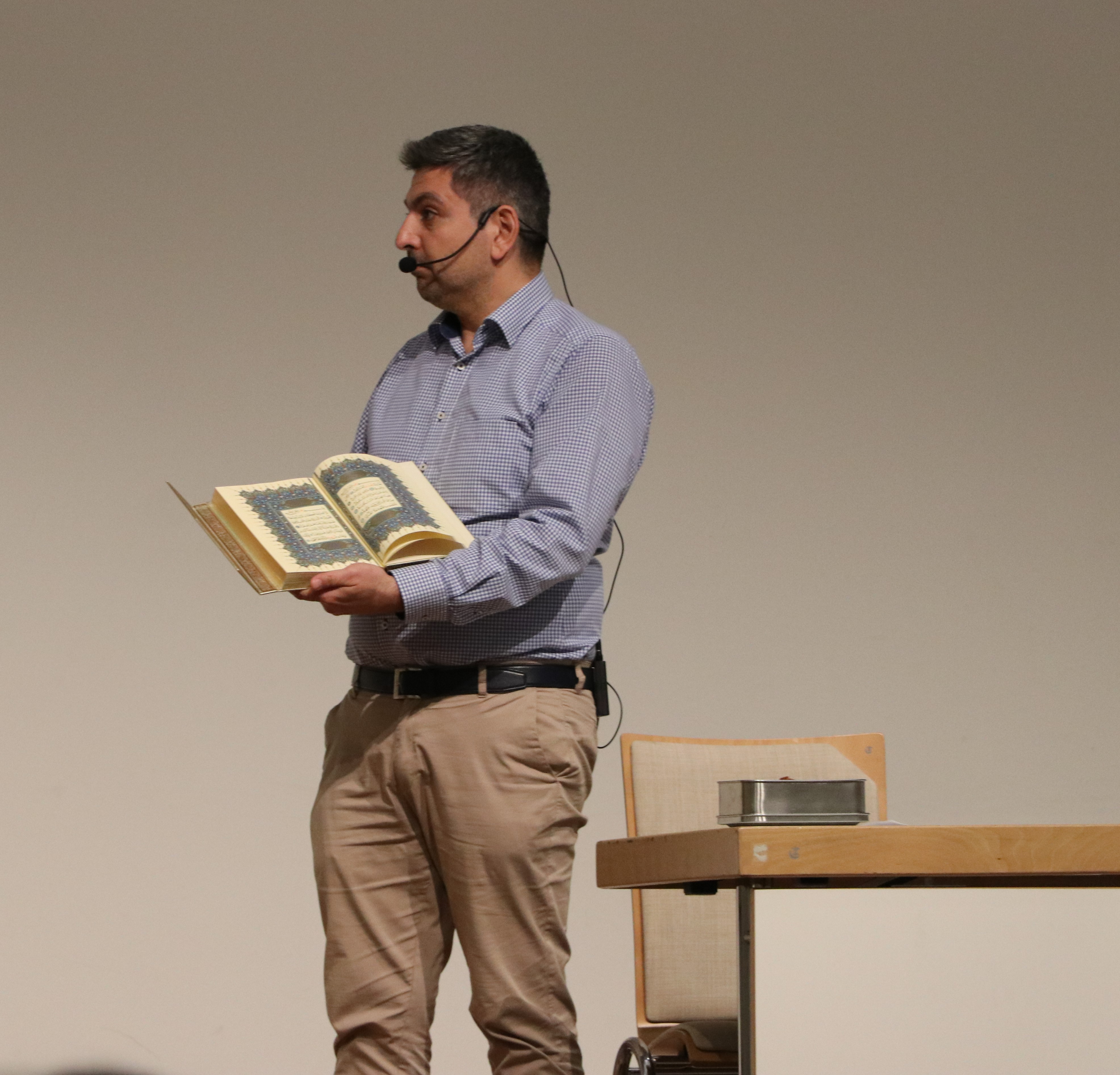 Akin Aslan präsentiert den Teilnehmenden die Koran.