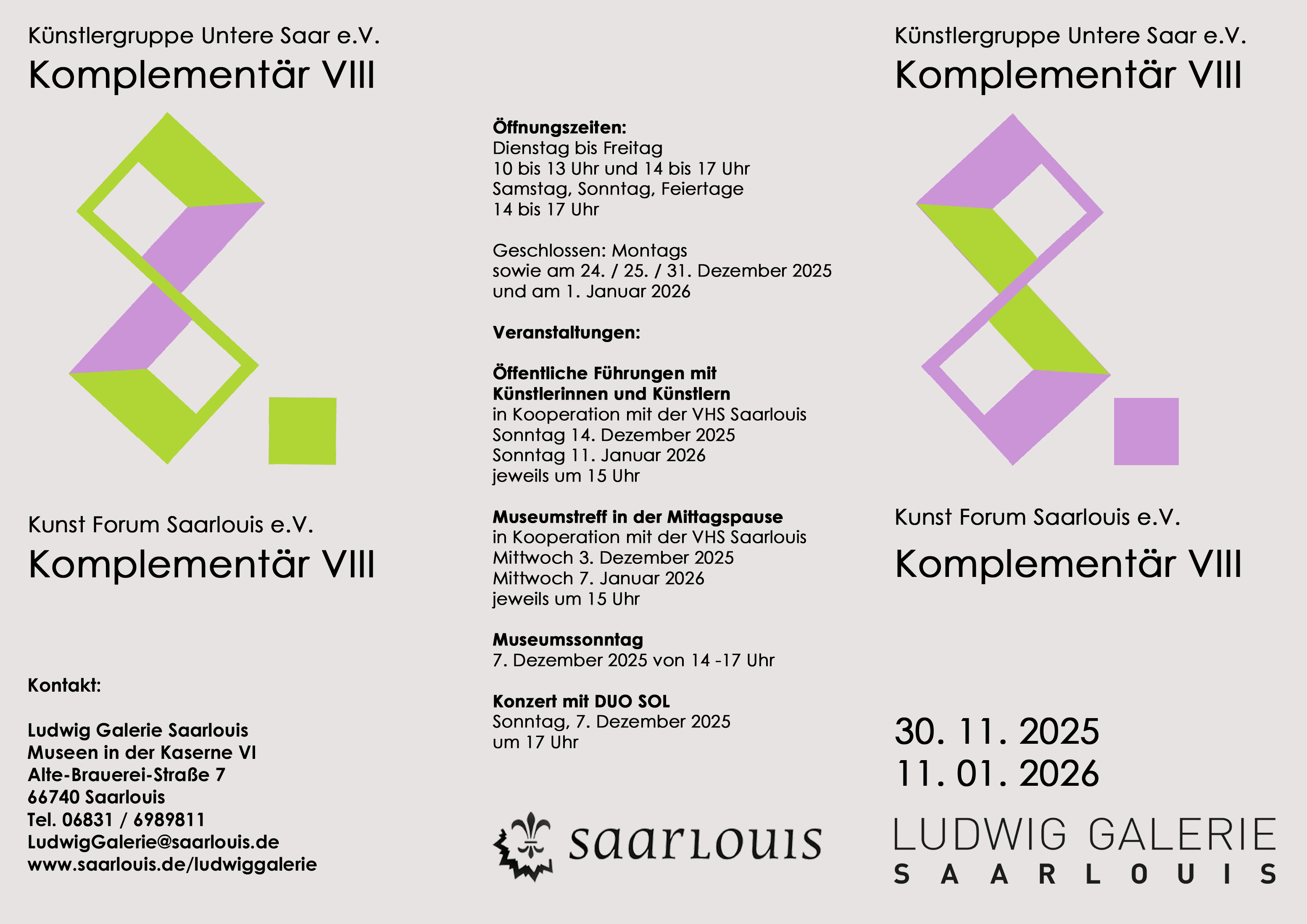 Unter dem Titel „Komplementär VIII“ werden auch 2025 in der Ludwig Galerie Saarlouis die beiden Jahresausstellungen der Künstlergruppe Untere Saar e.V. und des Kunst Forums Saarlouis e.V. präsentiert. Die Ausstellung gewährt überraschende Einblicke und neue Möglichkeiten, das Spektrum der Saarlouiser Künstlergruppen im gemeinsamen Austausch kennenzulernen.