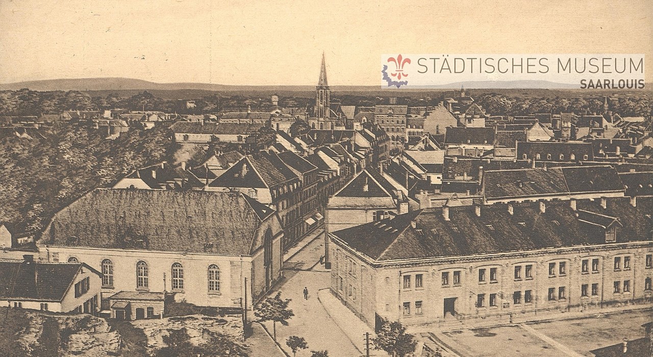 Diese Ansichtskarte bietet einen Blick aus Südwesten über die heutige Innenstadt. Es handelt sich hierbei aber nicht um eine Luftaufnahme, sondern um einen Ausblick vom Turm der neuen, 1906 fertiggestellten evangelischen Kirche. Im Vordergrund: die Kreuzung von Wall-, Silberherz- und Alte Brauerei-Straße. Rechts die Kaserne VI und links die Evangelische Garnisonskirche. Diese Garnisonskirche wurde auf Anordnung des preußischen Königs Friedrich Wilhelms III. am Fuße der Bastion V neu errichtet und 1822 fertiggestellt. Lange Jahre gab es in Saarlouis eine gemeinsame protestantische Gemeinde für Zivilisten und Militärangehörige. Die erste evangelische Kirche war ein Gebäude der Garnison, sie wurde schließlich im Jahre 1911 abgerissen.