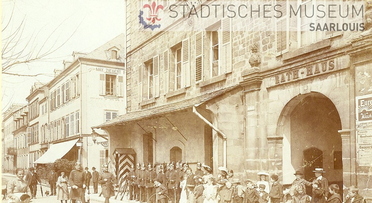 Das erste „Rath-Haus“ der Stadt Saarlouis befand sich an der Ecke Großer Markt / Grünebaumstraße, schräg gegenüber des heutigen Rathauses. Dementsprechend begann auch hier die Nummerierung des Großen Marktes mit der Hausnummer 1. Die Hauptwache der Garnison war bis 1918 im Erdgeschoss untergebracht. Die zeremonielle Wachablösung wurde hier vollzogen. Zu den Aufgaben der Wache zählte auch der sogenannten „Schlüsseldienst“ mit dem morgendlichen und abendlichen Transport der Schlüssel der beiden Stadttore und deren nächtlicher Sicherung innerhalb der Wache.