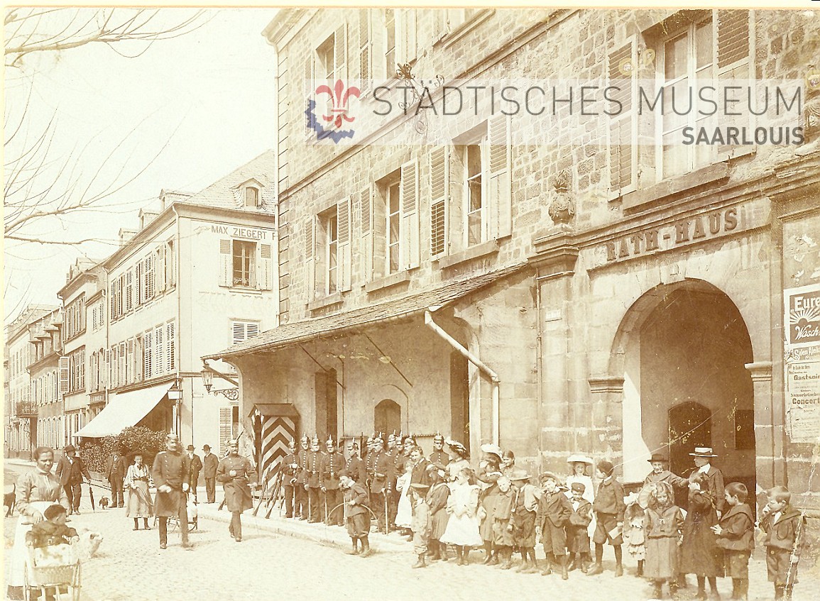 Das erste „Rath-Haus“ der Stadt Saarlouis befand sich an der Ecke Großer Markt / Grünebaumstraße, schräg gegenüber des heutigen Rathauses. Dementsprechend begann auch hier die Nummerierung des Großen Marktes mit der Hausnummer 1. Die Hauptwache der Garnison war bis 1918 im Erdgeschoss untergebracht. Die zeremonielle Wachablösung wurde hier vollzogen. Zu den Aufgaben der Wache zählte auch der sogenannten „Schlüsseldienst“ mit dem morgendlichen und abendlichen Transport der Schlüssel der beiden Stadttore und deren nächtlicher Sicherung innerhalb der Wache.