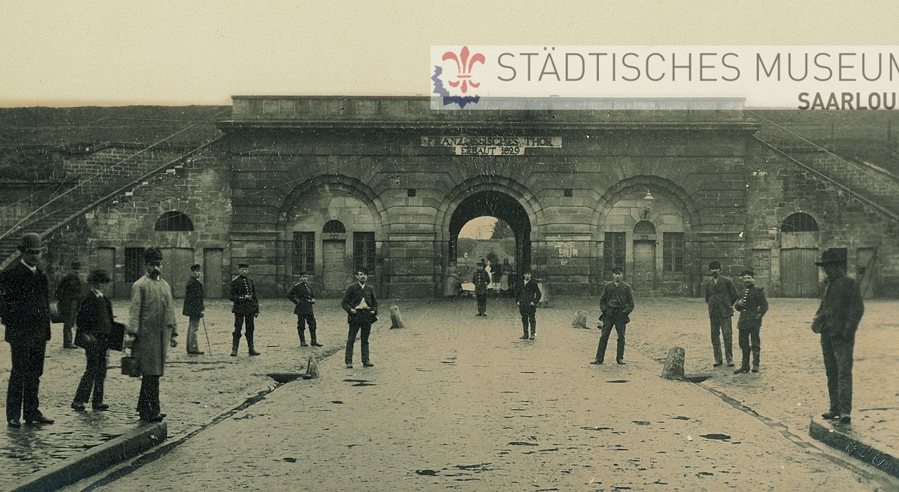 Im Zuge der Modernisierung der Festungsanlagen in preußischer Zeit wurde 1829 auch das Französische Tor grundlegend umgebaut. Die repräsentative Gestaltung der Anlage wurde durch ein massives Festungswerkes ersetzt, das auch der modernen Artillerie besser standhalten sollte. Bis zu seinem Abbruch 1889/90 bildete das Tor einen imposanten Abschluss des „Schweinemarktes“. Seinen ursprünglichen Namen hatte der Platz von den Vieh- und Bauernmärkten, die hier abgehalten wurden. Die Bezeichnung „Kleiner Markt“, als Gegenstück zum Großen Markt, entwickelte sich interessanter Weise erst mit der Vergrößerung des Platzes im Anschluss an die Abtragung der Toranalage. Zur Orientierung: Die beiden Herren auf der Bordsteinkante stehen am Ende der Französischen Straße.