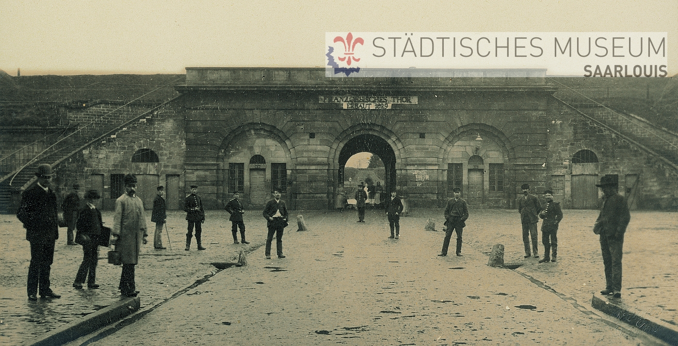 Im Zuge der Modernisierung der Festungsanlagen in preußischer Zeit wurde 1829 auch das Französische Tor grundlegend umgebaut. Die repräsentative Gestaltung der Anlage wurde durch ein massives Festungswerkes ersetzt, das auch der modernen Artillerie besser standhalten sollte. Bis zu seinem Abbruch 1889/90 bildete das Tor einen imposanten Abschluss des „Schweinemarktes“. Seinen ursprünglichen Namen hatte der Platz von den Vieh- und Bauernmärkten, die hier abgehalten wurden. Die Bezeichnung „Kleiner Markt“, als Gegenstück zum Großen Markt, entwickelte sich interessanter Weise erst mit der Vergrößerung des Platzes im Anschluss an die Abtragung der Toranalage. Zur Orientierung: Die beiden Herren auf der Bordsteinkante stehen am Ende der Französischen Straße.
