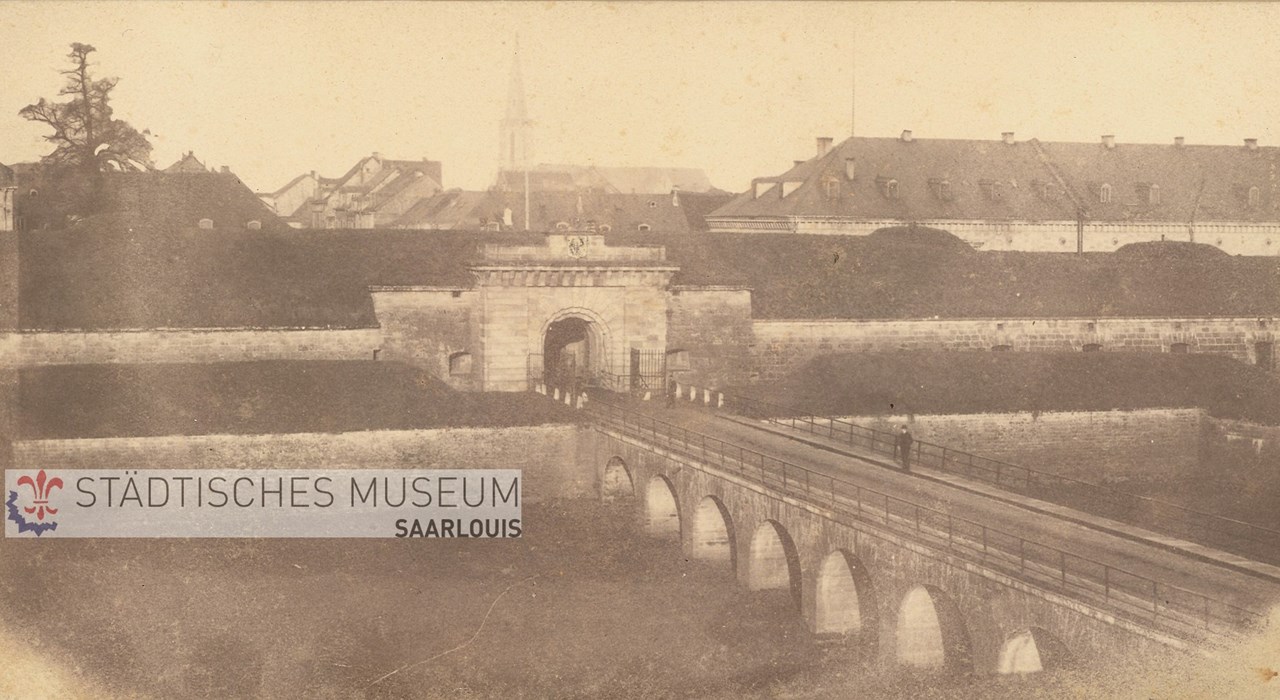 Etwa aus der gleichen Zeit wie Ansicht 7 stammt dieses Foto von der Außenseite, der sogenannten Feldseite, des Französischen Tores. Die Modernisierung der Festungsanlagen in preußischer Zeit, unter besonderer Berücksichtigung der Weiterentwicklung der Artillerie, wird hier ebenfalls deutlich. Die repräsentative Fassade ist verschwunden. Der Torbau selbst scheint fast verschwunden zu sein und ist auf die Höhe des Walls reduziert und massiv verstärkt. Eine Brücke mit insgesamt acht Bögen (nicht alle sind hier sichtbar) überspannt den 36 Meter breiten Hauptgraben. Vor dem Tor ist die im Graben liegende ‚Grabenschere‘ zu erkennen, welche die Basis des Hauptwalls zusätzlich vor Beschuss schützt.
