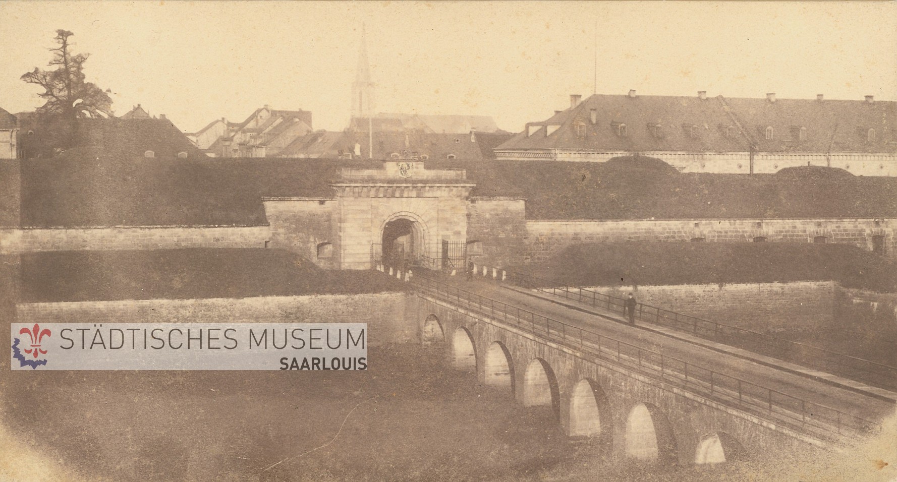 Etwa aus der gleichen Zeit wie Ansicht 7 stammt dieses Foto von der Außenseite, der sogenannten Feldseite, des Französischen Tores. Die Modernisierung der Festungsanlagen in preußischer Zeit, unter besonderer Berücksichtigung der Weiterentwicklung der Artillerie, wird hier ebenfalls deutlich. Die repräsentative Fassade ist verschwunden. Der Torbau selbst scheint fast verschwunden zu sein und ist auf die Höhe des Walls reduziert und massiv verstärkt. Eine Brücke mit insgesamt acht Bögen (nicht alle sind hier sichtbar) überspannt den 36 Meter breiten Hauptgraben. Vor dem Tor ist die im Graben liegende ‚Grabenschere‘ zu erkennen, welche die Basis des Hauptwalls zusätzlich vor Beschuss schützt.