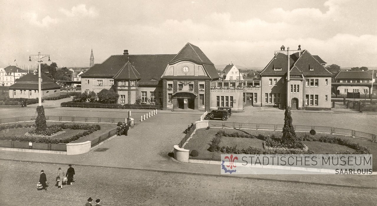 Durch das stark ansteigende Verkehrsaufkommen erwägte die Reichsbahn nach der Jahrhundertwende den Neubau des Bahnhofs bei Saarlouis. Die Stadt sah in einer Verlegung des Bahnhofs auf Rodener Bann, bei gleichzeitiger Vereinigung mit der Landgemeinde Roden, die Chance, ihre verkehrstechnische Lage wesentlich zu verbessern. Der letzte Paragraph des Vereinigungsvertrages zwischen Saarlouis und Roden, der ein Inkrafttreten der Vereinbarung ausdrücklich nur bei einem Neubau des Bahnhofes auf Rodener Gebiet vorsah, verdeutlicht diesen engen Zusammenhang. Eine grundlegende Bedingung von Seiten der Reichsbahn für die örtliche Verlegung des Bahnhofes war die Übernahme der Baukosten für die neuen Bahnhofsgebäude durch die Stadt Saarlouis. Der neue Bahnhof wird im Jahr 1910 in Betrieb genommen. Diese Ansichtskarte zeigt auch die ursprüngliche Gestaltung des Bahnhofsvorplatzes.