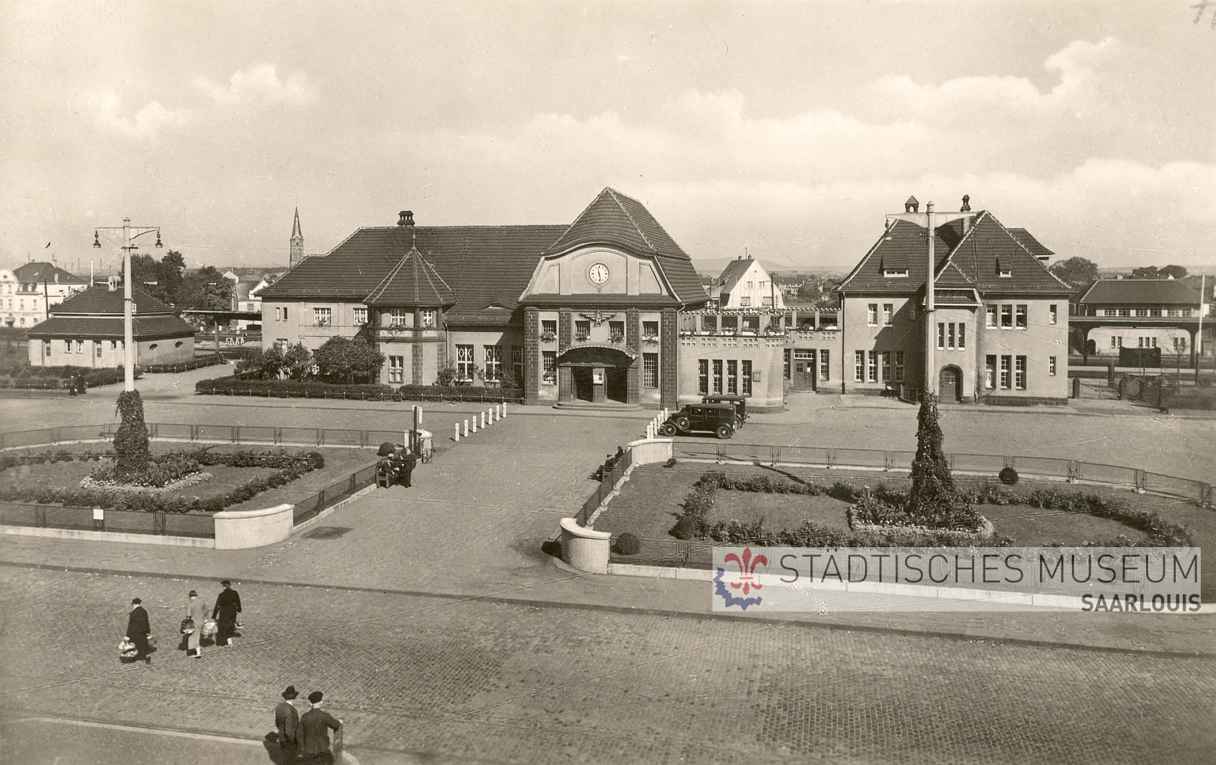 Durch das stark ansteigende Verkehrsaufkommen erwägte die Reichsbahn nach der Jahrhundertwende den Neubau des Bahnhofs bei Saarlouis. Die Stadt sah in einer Verlegung des Bahnhofs auf Rodener Bann, bei gleichzeitiger Vereinigung mit der Landgemeinde Roden, die Chance, ihre verkehrstechnische Lage wesentlich zu verbessern. Der letzte Paragraph des Vereinigungsvertrages zwischen Saarlouis und Roden, der ein Inkrafttreten der Vereinbarung ausdrücklich nur bei einem Neubau des Bahnhofes auf Rodener Gebiet vorsah, verdeutlicht diesen engen Zusammenhang. Eine grundlegende Bedingung von Seiten der Reichsbahn für die örtliche Verlegung des Bahnhofes war die Übernahme der Baukosten für die neuen Bahnhofsgebäude durch die Stadt Saarlouis. Der neue Bahnhof wird im Jahr 1910 in Betrieb genommen. Diese Ansichtskarte zeigt auch die ursprüngliche Gestaltung des Bahnhofsvorplatzes.