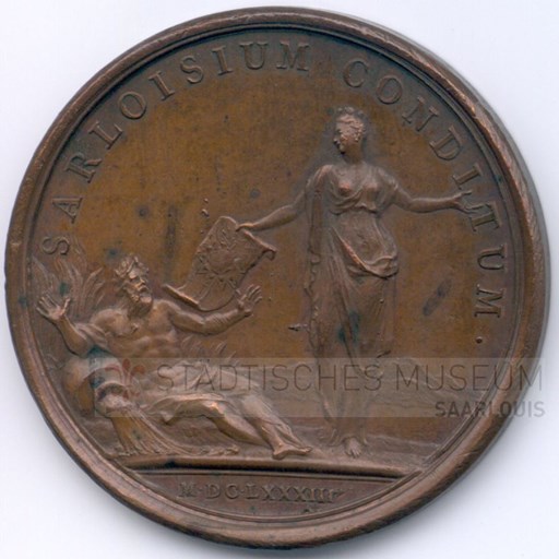 Öffentlichkeitsarbeit ist keine Erfindung des 20. Jahrhunderts wie diese bronzene Medaille aus dem Jahr 1683 belegt. Ludwig XIV lässt zur öffentlichen Darstellung und Bekanntmachung militärischer und politischer Erfolge Druckgrafiken verbreiten und in besonderen Fällen Gedenkmedaillen prägen. Hierzu zählt auch diese Medaille zur Gründung der Festungsstadt Saarlouis.