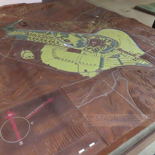 Modell des sogenannten ‚Menkes-Plans‘ für den Wiederaufbau der Stadt Saarlouis nach dem Zweiten Weltkrieg. Der französische Architekt und Städteplaner Edouard Menkès kam im Jahr 1946 im Auftrag der Militärregierung nach Saarlouis, um einen umfassenden Bebauungs- und Wiederaufbauplan für das Stadtgebiet zu entwickeln. Seine Planungen scheitern nicht zuletzt auch am Widerstand der Bevölkerung, denn so sollten laut diesen Entwürfen zum Beispiel die Stadtteile Roden und Fraulautern vollständig verschwinden.