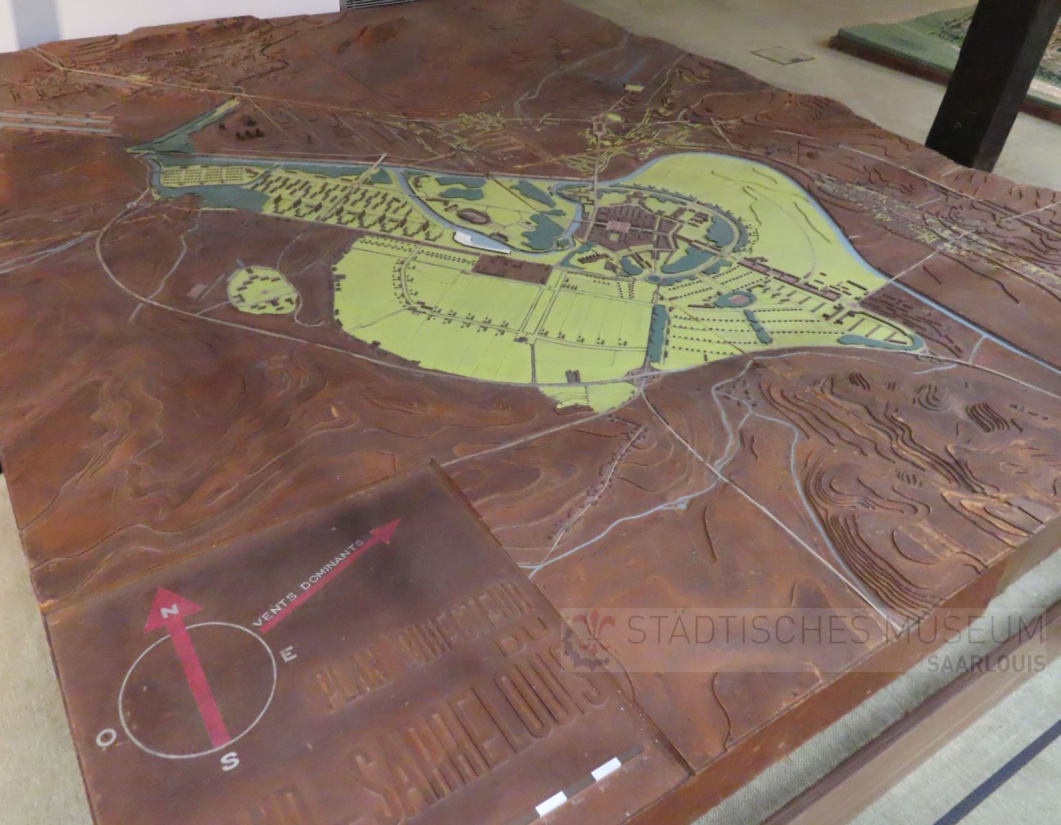 Modell des sogenannten ‚Menkes-Plans‘ für den Wiederaufbau der Stadt Saarlouis nach dem Zweiten Weltkrieg. Der französische Architekt und Städteplaner Edouard Menkès kam im Jahr 1946 im Auftrag der Militärregierung nach Saarlouis, um einen umfassenden Bebauungs- und Wiederaufbauplan für das Stadtgebiet zu entwickeln. Seine Planungen scheitern nicht zuletzt auch am Widerstand der Bevölkerung, denn so sollten laut diesen Entwürfen zum Beispiel die Stadtteile Roden und Fraulautern vollständig verschwinden.