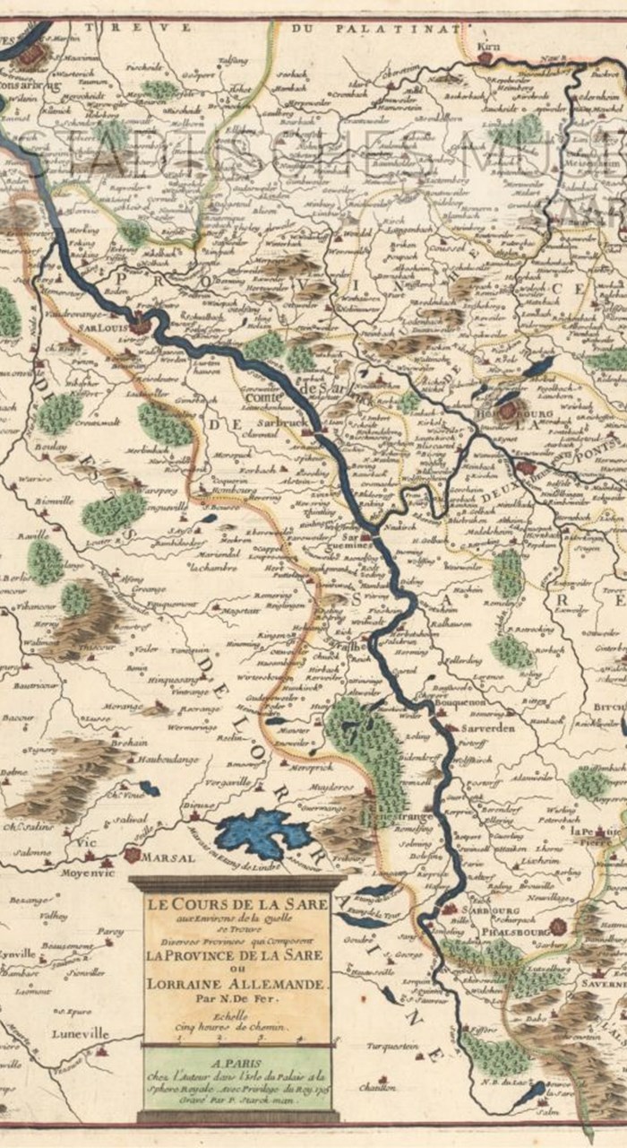 Das Museum verfügt über eine umfangreiche Sammlung historischer Karten der Saargegend und der Großregion. Ein besonders schönes Beispiel ist diese Karte des gesamten Saarlaufes, sowohl hinsichtlich ihrer Kolorierung, als auch in Bezug auf ihren Inhalt. Befasst sie sich doch als erste bekannte Karte detailliert und ausdrücklich mit dem Fluss und seiner Region und stellt auch als erste Karte den Verlauf von der Quelle bis zur Mündung in Gänze dar. Die Karte ist auch ein Indiz dafür, dass die Region zunehmend in das Interesse der bourbonischen Expansionspolitik gerückt ist.
