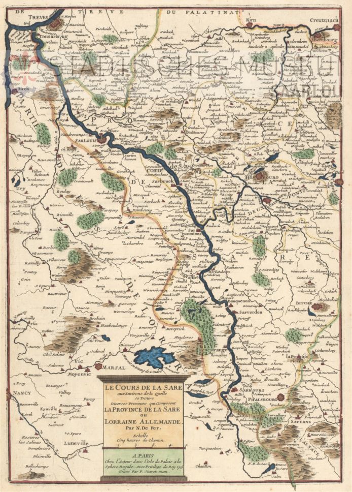 Das Museum verfügt über eine umfangreiche Sammlung historischer Karten der Saargegend und der Großregion. Ein besonders schönes Beispiel ist diese Karte des gesamten Saarlaufes, sowohl hinsichtlich ihrer Kolorierung, als auch in Bezug auf ihren Inhalt. Befasst sie sich doch als erste bekannte Karte detailliert und ausdrücklich mit dem Fluss und seiner Region und stellt auch als erste Karte den Verlauf von der Quelle bis zur Mündung in Gänze dar. Die Karte ist auch ein Indiz dafür, dass die Region zunehmend in das Interesse der bourbonischen Expansionspolitik gerückt ist.