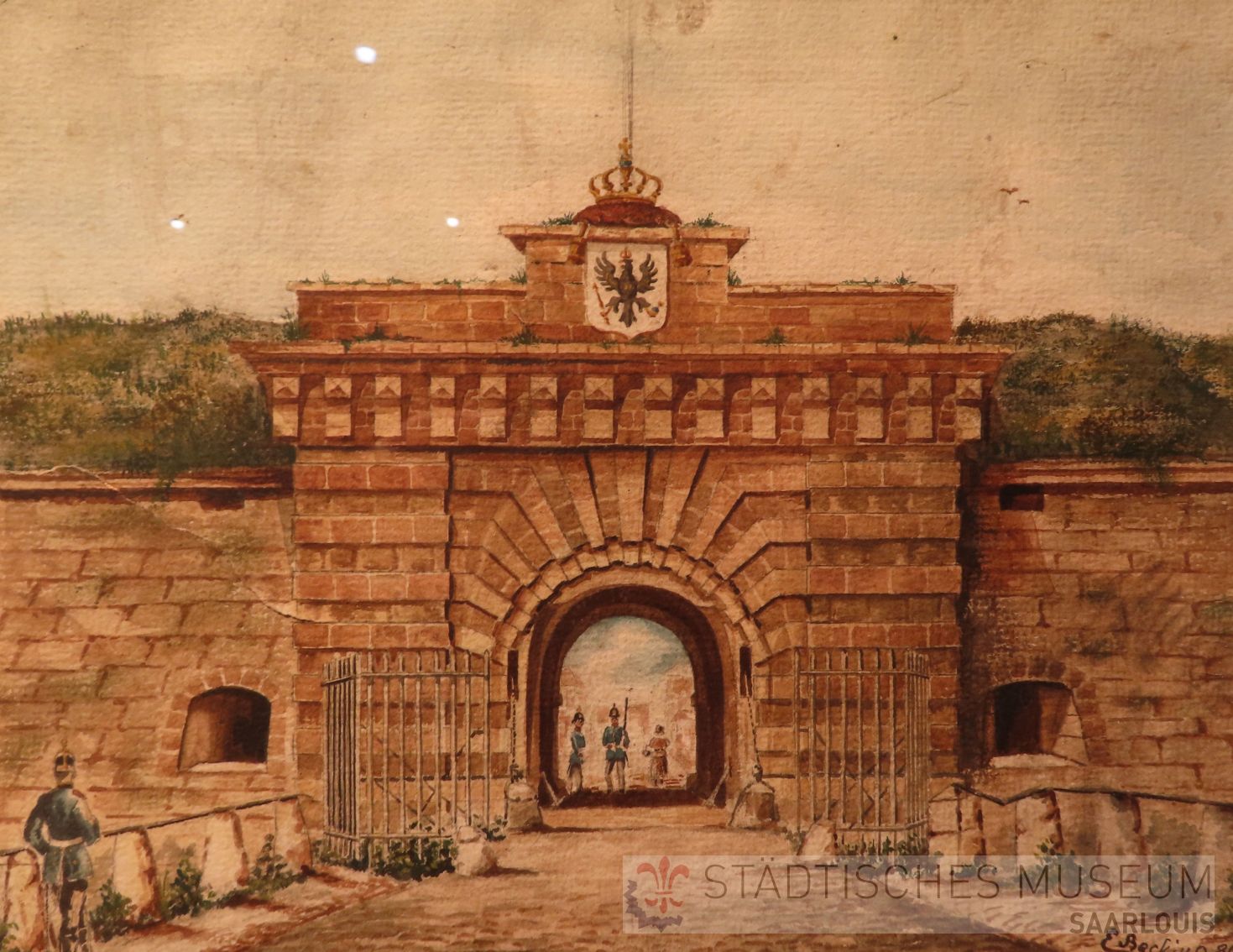 Aquarell des Saarlouiser Malers Eduard Becking aus dem Jahr 1886. Das Gemälde zeigt die Feldseite des Französischen Tores kurz vor der Abtragung der Anlage im Rahmen der Entfestigung der Stadt Saarlouis. Die Tore wurden in preußischer Zeit der Festung stark verändert. Die prachtvollen, repräsentativen Gebäude wurden durch rein zweckmäßige Anlagen ersetzt, die der Entwicklung der Artillerietechnik Rechnung trugen. Der einzige Schmuck der Tore bestand nun aus dem königlich-preußischen Wappen und der darüber platzierten Königskrone.