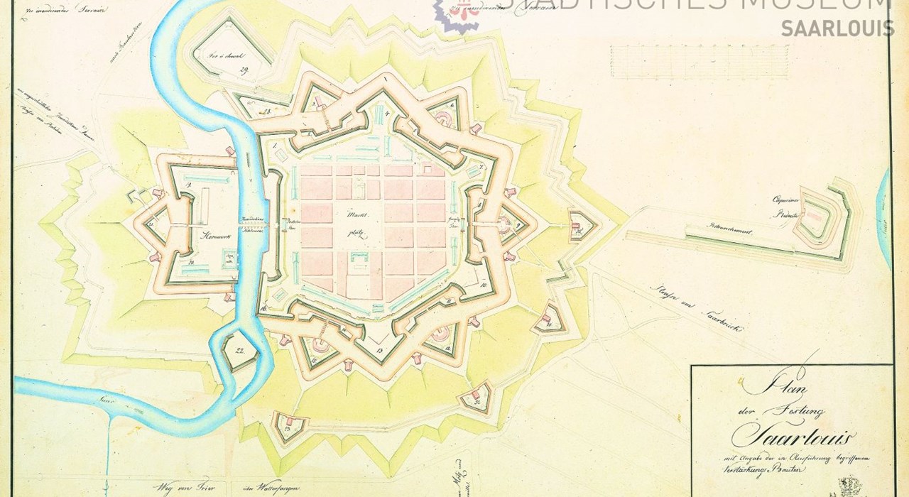 Recht schnell nach der Übernahme der Festung Saarlouis am 1. Dezember 1815, begannen die Preußen mit der Modernisierung der Festungsanlagen. Dieser Plan des zuständigen Platzingenieurs Hauptmann Haak, der von 1818 bis 1824 in Saarlouis verantwortlich war, liefert uns einen ersten Überblick über die zu Beginn in Angriff genommenen Maßnahmen. Denn der Plan enthält, wie im Untertitel genannt: die „in Ausführung begriffenen Verstärkungs Bauten“.