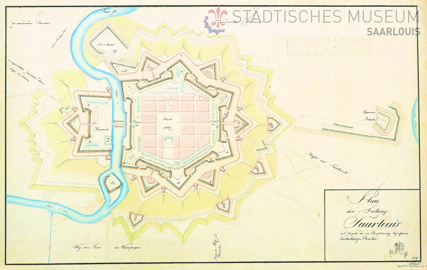 Recht schnell nach der Übernahme der Festung Saarlouis am 1. Dezember 1815, begannen die Preußen mit der Modernisierung der Festungsanlagen. Dieser Plan des zuständigen Platzingenieurs Hauptmann Haak, der von 1818 bis 1824 in Saarlouis verantwortlich war, liefert uns einen ersten Überblick über die zu Beginn in Angriff genommenen Maßnahmen. Denn der Plan enthält, wie im Untertitel genannt: die „in Ausführung begriffenen Verstärkungs Bauten“.