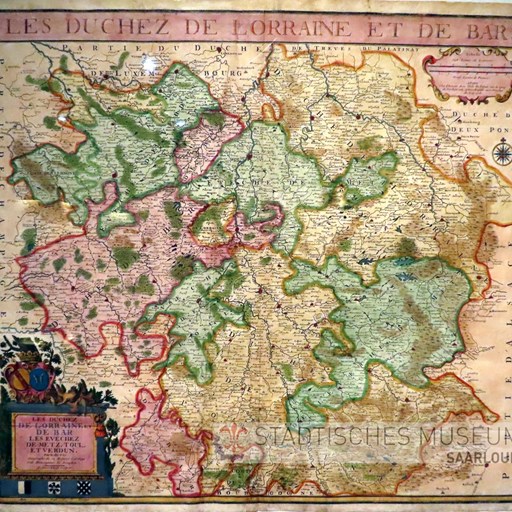 Französische Karte der Region Lothringen nach dem Frieden von Rijwijk 1697, durch den die französische Besatzung großer Teile der lothringischen Gebiete beendet wurde. Die Territorien sind, nach heutigen Maßstäben etwas ungenau, durch Grenz- und Flächenkolorit dargestellt. Lothringen in Gelb, Bar in Rot und die bei Frankreich verbliebene Provinz der ‚Drei Bistümer‘ in Grün. Saarlouis lag zwar inmitten von lothringischem Territorium, blieb aber als Exklave französisch und gehörte zur Provinz der Bistümer. Der Name der Stadt „Sar-Louis“ ist daher auf dieser Karte mit dem Zusatz „au roi“ versehen, was in etwa bedeutet: ‚dem König gehörend‘ oder ‚zum Königreich gehörend‘.