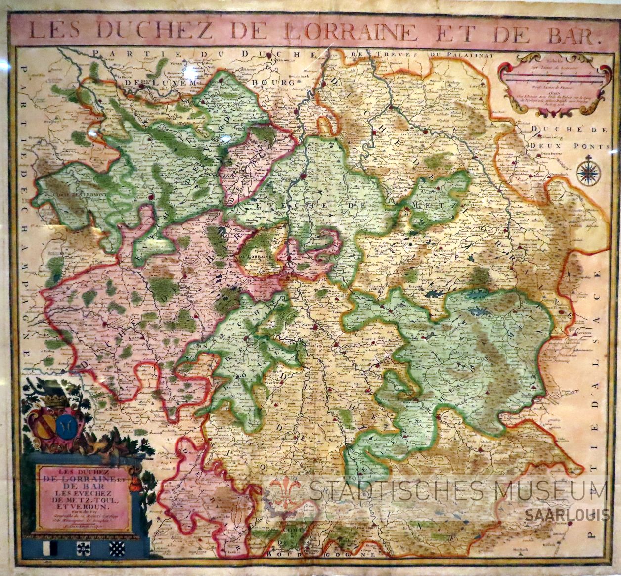 Französische Karte der Region Lothringen nach dem Frieden von Rijwijk 1697, durch den die französische Besatzung großer Teile der lothringischen Gebiete beendet wurde. Die Territorien sind, nach heutigen Maßstäben etwas ungenau, durch Grenz- und Flächenkolorit dargestellt. Lothringen in Gelb, Bar in Rot und die bei Frankreich verbliebene Provinz der ‚Drei Bistümer‘ in Grün. Saarlouis lag zwar inmitten von lothringischem Territorium, blieb aber als Exklave französisch und gehörte zur Provinz der Bistümer. Der Name der Stadt „Sar-Louis“ ist daher auf dieser Karte mit dem Zusatz „au roi“ versehen, was in etwa bedeutet: ‚dem König gehörend‘ oder ‚zum Königreich gehörend‘.