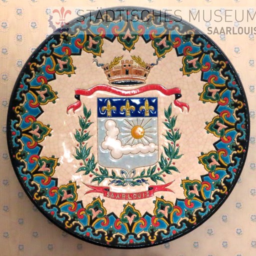 Im Juli des Jahres 1683 besucht Ludwig XIV. die Baustelle der neuen Festungsstadt an der Saar, der er seinen Namen gab. Bei dieser Gelegenheit verlieh er der Stadt auch ein Wappen, das mit den goldenen Lilien und dem Bild der Sonne eindeutig auf seine Person hinweist. Die Stadt führt dieses Wappen bis heute, es ist das älteste kommunale Wappen im Saarland. Hier ist es abgebildet auf einem schmuckvollen Wandteller aus den 1960er Jahren, den die Stadtverwaltung Saarlouis in mehrfacher Ausfertigung im „Atelier d’Art“ in der “Schwesterstadt“ Longwy in Auftrag gab. Alle Stücke sind handwerkliche Unikate. Sie wurden als Geschenke der Stadt für besondere Anlässe verwendet. Zwei dieser Teller, haben mittlerweile den Weg in die Sammlung des Museums gefunden.