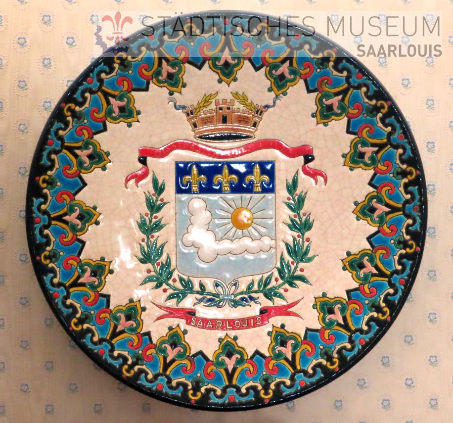 Im Juli des Jahres 1683 besucht Ludwig XIV. die Baustelle der neuen Festungsstadt an der Saar, der er seinen Namen gab. Bei dieser Gelegenheit verlieh er der Stadt auch ein Wappen, das mit den goldenen Lilien und dem Bild der Sonne eindeutig auf seine Person hinweist. Die Stadt führt dieses Wappen bis heute, es ist das älteste kommunale Wappen im Saarland. Hier ist es abgebildet auf einem schmuckvollen Wandteller aus den 1960er Jahren, den die Stadtverwaltung Saarlouis in mehrfacher Ausfertigung im „Atelier d’Art“ in der “Schwesterstadt“ Longwy in Auftrag gab. Alle Stücke sind handwerkliche Unikate. Sie wurden als Geschenke der Stadt für besondere Anlässe verwendet. Zwei dieser Teller, haben mittlerweile den Weg in die Sammlung des Museums gefunden.