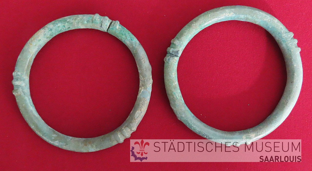 Auf der Steinrausch, auf damals noch Fraulauterner Bann, wurden zwischen 1970 und 1973 insgesamt sieben, von vermuteten acht keltischen Hügelgräbern aus der späten Hallstattzeit (etwa 600 – 450 v.Chr.) archäologische ausgegraben und ausführlich dokumentiert. Die hier gezeigten bronzenen Beinringe wurden im Grab Nr. 14 des Hügels Nr.6 im Jahr 1972 gefunden. Die Fundstelle liegt in etwa im Bereich des heutigen „von-Humbolt-Weges“. Die beiden gegossenen Ringe haben einen Durchmesser von zirka 10 cm und eine Stärke von rund 10 mm. Sie zeichnen sich durch ihren guten Erhaltungszustand und ihr Gewicht aus. Sie sind verziert mit je drei Gruppen zu je drei Rippen.