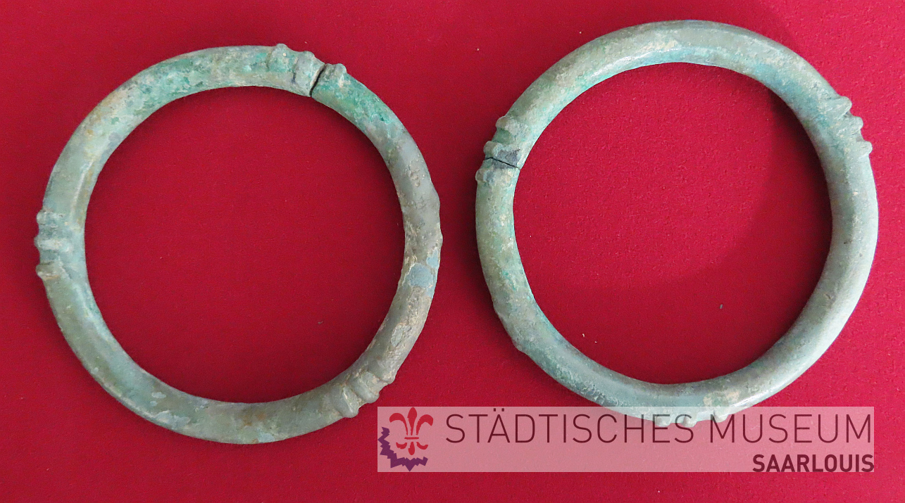 Auf der Steinrausch, auf damals noch Fraulauterner Bann, wurden zwischen 1970 und 1973 insgesamt sieben, von vermuteten acht keltischen Hügelgräbern aus der späten Hallstattzeit (etwa 600 – 450 v.Chr.) archäologische ausgegraben und ausführlich dokumentiert. Die hier gezeigten bronzenen Beinringe wurden im Grab Nr. 14 des Hügels Nr.6 im Jahr 1972 gefunden. Die Fundstelle liegt in etwa im Bereich des heutigen „von-Humbolt-Weges“. Die beiden gegossenen Ringe haben einen Durchmesser von zirka 10 cm und eine Stärke von rund 10 mm. Sie zeichnen sich durch ihren guten Erhaltungszustand und ihr Gewicht aus. Sie sind verziert mit je drei Gruppen zu je drei Rippen.