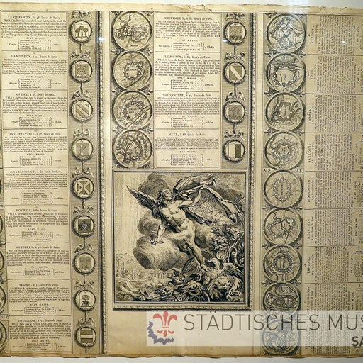 Großes Kupferstich-Blatt (66x50 cm) mit der Beschreibung von 22 Festungsanlagen inklusive einfacher Pläne und Wappen. Ursprünglich wurden die hier verwendeten kleinen Festungspläne meist als dekorative, aber auch informative Randdarstellungen für Landkarten hergestellt. In einer weiteren Verwendung wurden die vorhanden Druckplatten aber auch für die Zusammenstellung solcher lexikalischen Blätter genutzt. Saarlouis findet sich übrigens in der rechten Spalte, vierter Plan von oben. Oftmals wurden diese großen Blätter aber zerschnitten. Einerseits weil sie etwas unhandlich waren, aber insbesondere, um jeweils die kleinen Beschreibungen einzeln verkaufen zu können. Dass ein solches Blatt im Ganzen erhalten geblieben ist, ist eher eine Ausnahme.