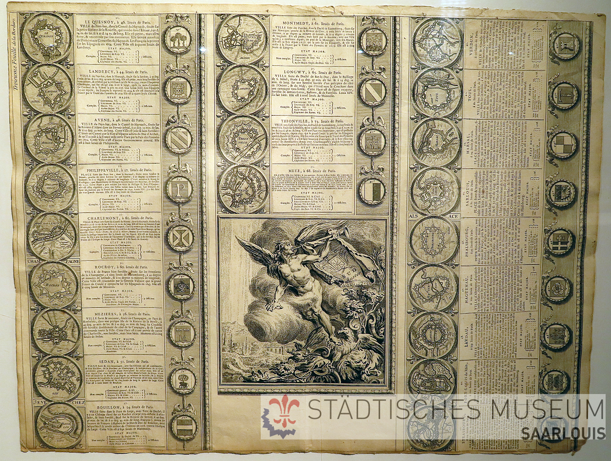 Großes Kupferstich-Blatt (66x50 cm) mit der Beschreibung von 22 Festungsanlagen inklusive einfacher Pläne und Wappen. Ursprünglich wurden die hier verwendeten kleinen Festungspläne meist als dekorative, aber auch informative Randdarstellungen für Landkarten hergestellt. In einer weiteren Verwendung wurden die vorhanden Druckplatten aber auch für die Zusammenstellung solcher lexikalischen Blätter genutzt. Saarlouis findet sich übrigens in der rechten Spalte, vierter Plan von oben. Oftmals wurden diese großen Blätter aber zerschnitten. Einerseits weil sie etwas unhandlich waren, aber insbesondere, um jeweils die kleinen Beschreibungen einzeln verkaufen zu können. Dass ein solches Blatt im Ganzen erhalten geblieben ist, ist eher eine Ausnahme.