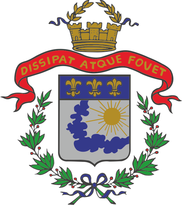 Das Saarlouiser Stadtwappen verweist auf den Gründer und Namensgeber der Stadt, den Sonnenkönig, Ludwig XIV. von Frankreich. Es zeigt bourbonische Lilien, Sonne, Wolken und der Wappenspruch "Dissipat atque fovet" - Sie (Die Sonne) zerstreut (die Wolken) und erwärmt (die Erde).