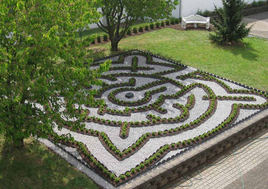 Zwei begehbare Labyrinthe, Symbole des Lebens, das Labyrinth der Katze (mit Mauerwurz, die Wege aus Kies) und das Labyrinth von Reims (Pflasterlabyrinth gezeichnet) laden zur (Geh-) Meditation ein.