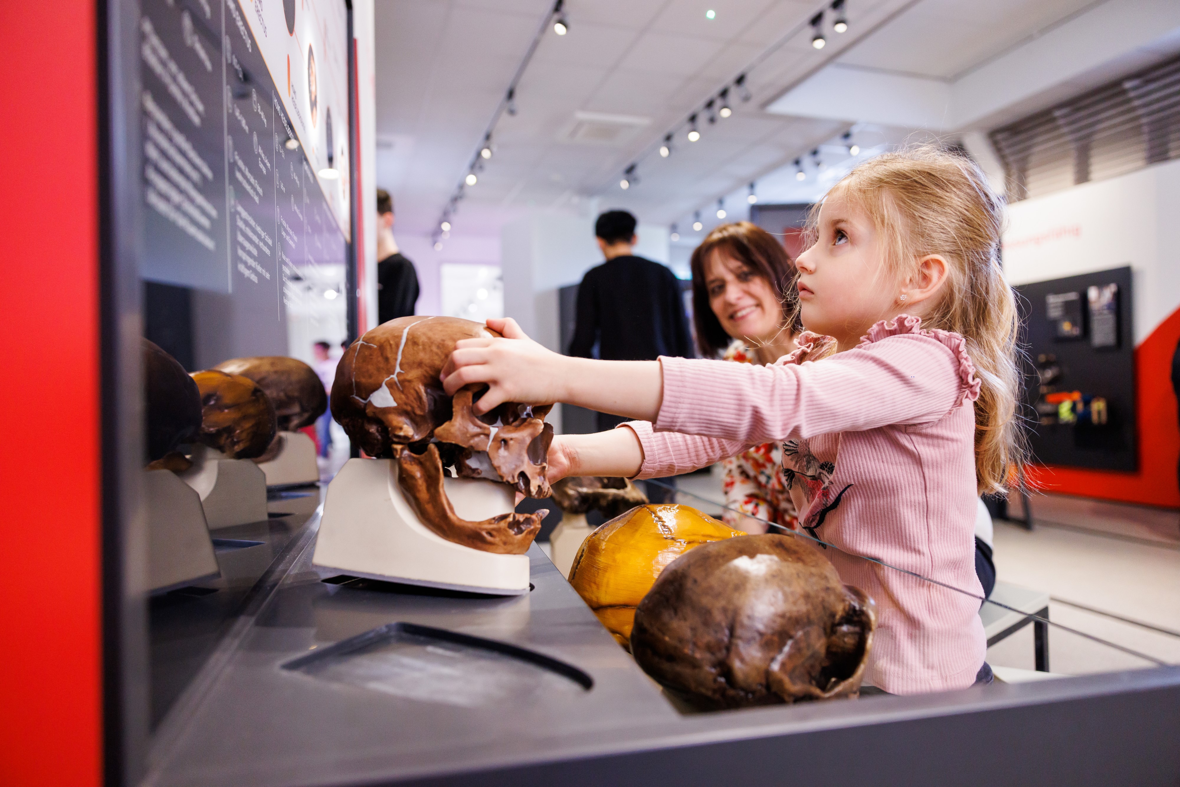 In zwei Bereiche gliedert sich die Ausstellung mit ihren Mitmachstationen: Im Teil „Du bist Wissenschaft“ erfahren Klein und Groß Verblüffendes über den Menschen, seine Entwicklung und seine besonderen Fähigkeiten: Wie hat sich der moderne Mensch entwickelt? Wie findet Denken statt? Und was passiert beim Alterungsprozess? Die Antworten darauf gibt es hier. Im Ausstellungsteil „Du schaffst Wissen“ können alle ihre eigenen Fertigkeiten an den interaktiven Stationen ausprobieren und entdecken.