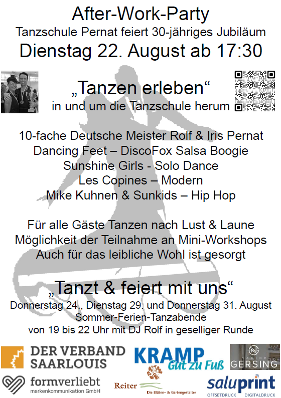 "Tanz mit uns" - so fordern Rolf & Iris Pernat alle Tanzfreunde auf, die Tanzpartys in den Sommerferien am Do 24., Di 29. und Do 31. August ab 19 Uhr zu besuchen. Wer der Tanzschule Pernat auf der Homepage www.tanzschule-saarlouis.de oder in social media folgt, wird über weitere Events im Herbst und Winter regelmäßig informiert.