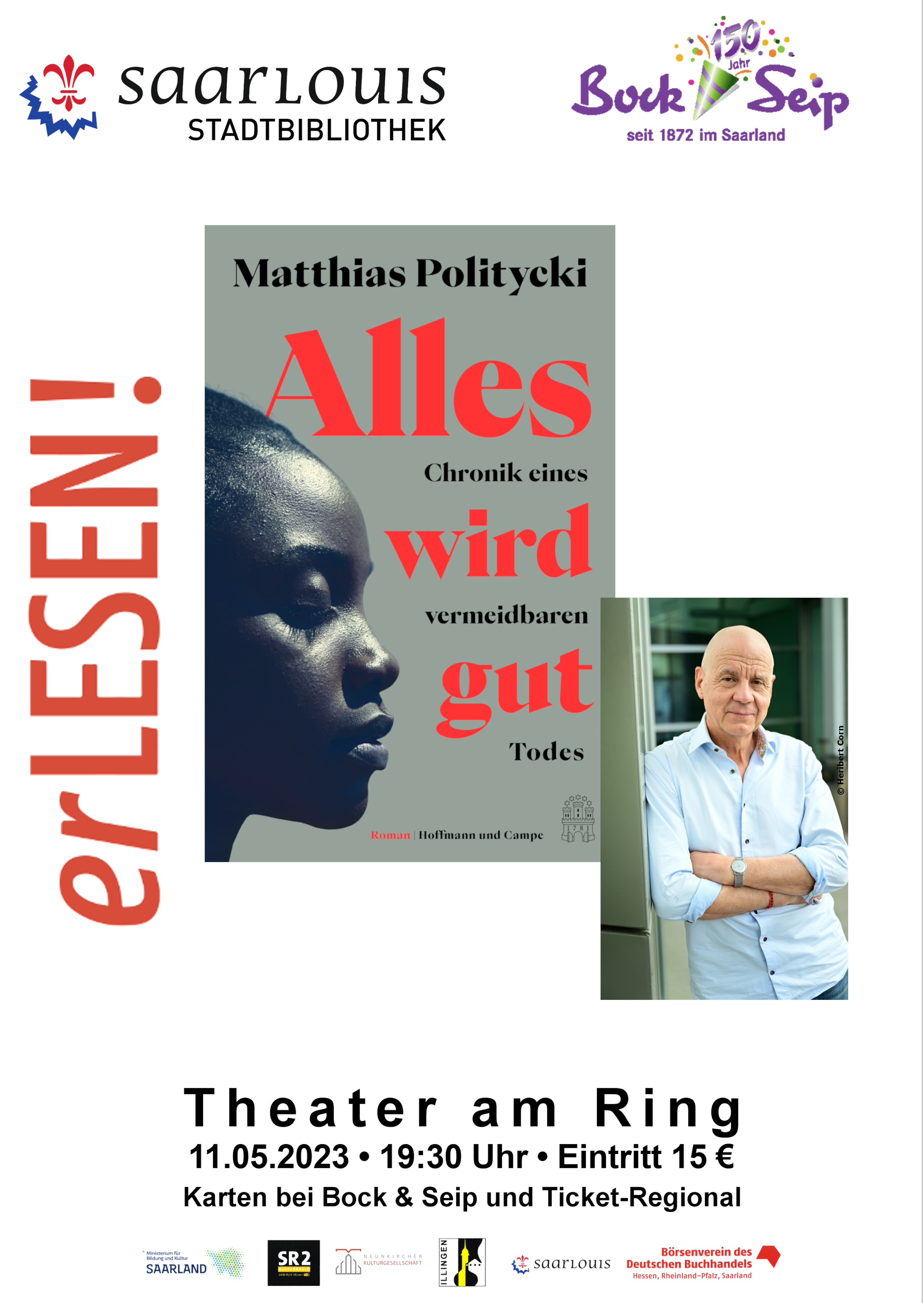 Die Stadtbibliothek Saarlouis und die Buchhandlung Bock & Seip freuen sich, im Rahmen des Literaturfestivals erLESEN den Bestsellerautor Matthias Politycki am Donnerstag, 11. Mai 2023 im Theater am Ring begrüßen zu können.