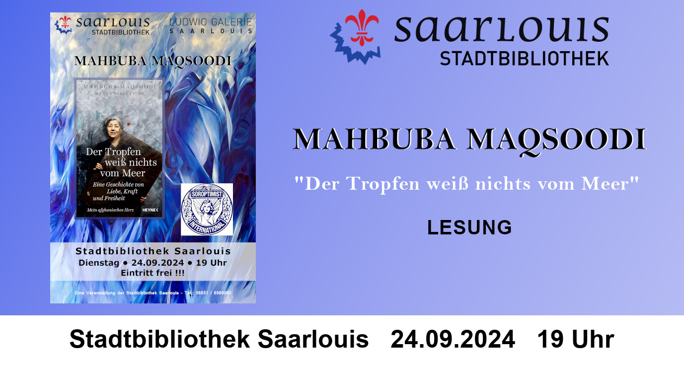 Die Künstlerin Mahbuba Maqsoodi kommt auf Einladung der Stadtbibliothek Saarlouis, dem SI-Club Merzig-Saarlouis von Soroptimist International und der Ludwig Galerie Saarlouis zur Lesung aus ihrer Autobiographie „Der Tropfen weiß nichts vom Meer - Eine Geschichte von Liebe, Kraft und Freiheit. Mein afghanisches Herz“ in die Stadtbibliothek Saarlouis.