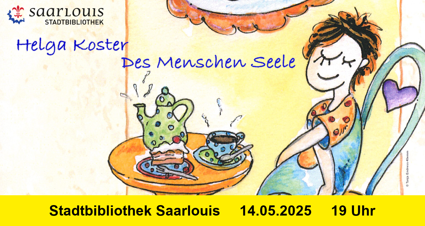 Die Saarlouiser Autorin und Lyrikerin Helga Koster wird am Mittwoch, dem 14. Mai 2025, in der Stadtbibliothek Saarlouis ihr neuestes Werk „Des Menschen Seele“ mit Aphorismen und Gedichten vorstellen. Die Lesung beginnt um 19:00 Uhr. Die Illustratorin des Bandes Tanja Endres-Klemm wird bei der Lesung dabei sein. Die Klarinettistin Lena Hein wird mit der Künstlerin und Musikerin die Lesung von Helga Koster musikalisch umrahmen. Helga Koster hat bisher mehrere Bücher mit Lyrik, Geschichten und Märchen veröffentlicht. 2022 erschien ihre Anthologie „Verschlüsselte Lebensträume“. „Des Menschen Seele“, ist ihr zehntes Buch. Mit den darin enthaltenen Gedichten und Aphorismen will die Autorin zum Nachdenken über das Leben anregen. Die Autorin war lange als Sozialarbeiterin, Beraterin und Supervisorin tätig und hat so in vielen Bereichen Erfahrungen gesammelt, die in ihren Gedichten und Prosatexten einfließen. Es sind unterhaltsame Texte, auch diejenigen in denen Helga Koster ihre kritischen Gedanken zu der Gesellschaft und dem Schicksal einfließen lässt. Im Rahmen der Lesung kann man mit der Autorin persönlich über ihr neustes Buch und ihre anderen Werke reden. Die Lesung findet bei freiem Eintritt am Mittwoch, 14. Mai 2025 um 19:00 Uhr in der Stadtbibliothek Saarlouis statt. Man findet sie im Untergeschoss des Theater am Ring, Kaiser-Friedrich-Ring 26, 66740 Saarlouis.
