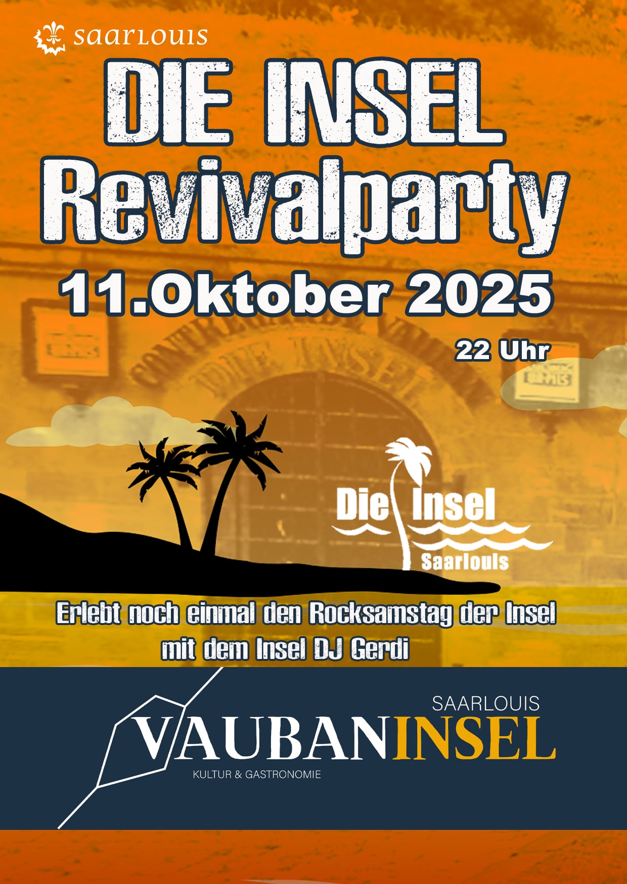 Zurück in die gute alte Zeit, sich wieder wie 18 fühlen und an einem legendären Ort eine legendäre Nacht verbringen. Die Insel auf der Saarlouiser Vauban Insel war für viele Jahre die Institution im Saarlouiser Nachtleben. Viele haben hier ihre Wochenenden verbracht und die Nacht zum Tag gemacht. Am Samstag 11. Oktober gibt es die einmalige Chance dabei zu sein, wenn wir Die Insel wieder aufsperren. Den Soundtrack eurer Jugend liefert euch Insel DJ Gerdi mit einem Mix der besten Rocksongs. Einlass: 22 Uhr Eintritt: 10 € Ab 18 Jahren - Bitte bring deinen Personalausweis mit! Ticket VVK-Start: 08.09.2025, 12 Uhr