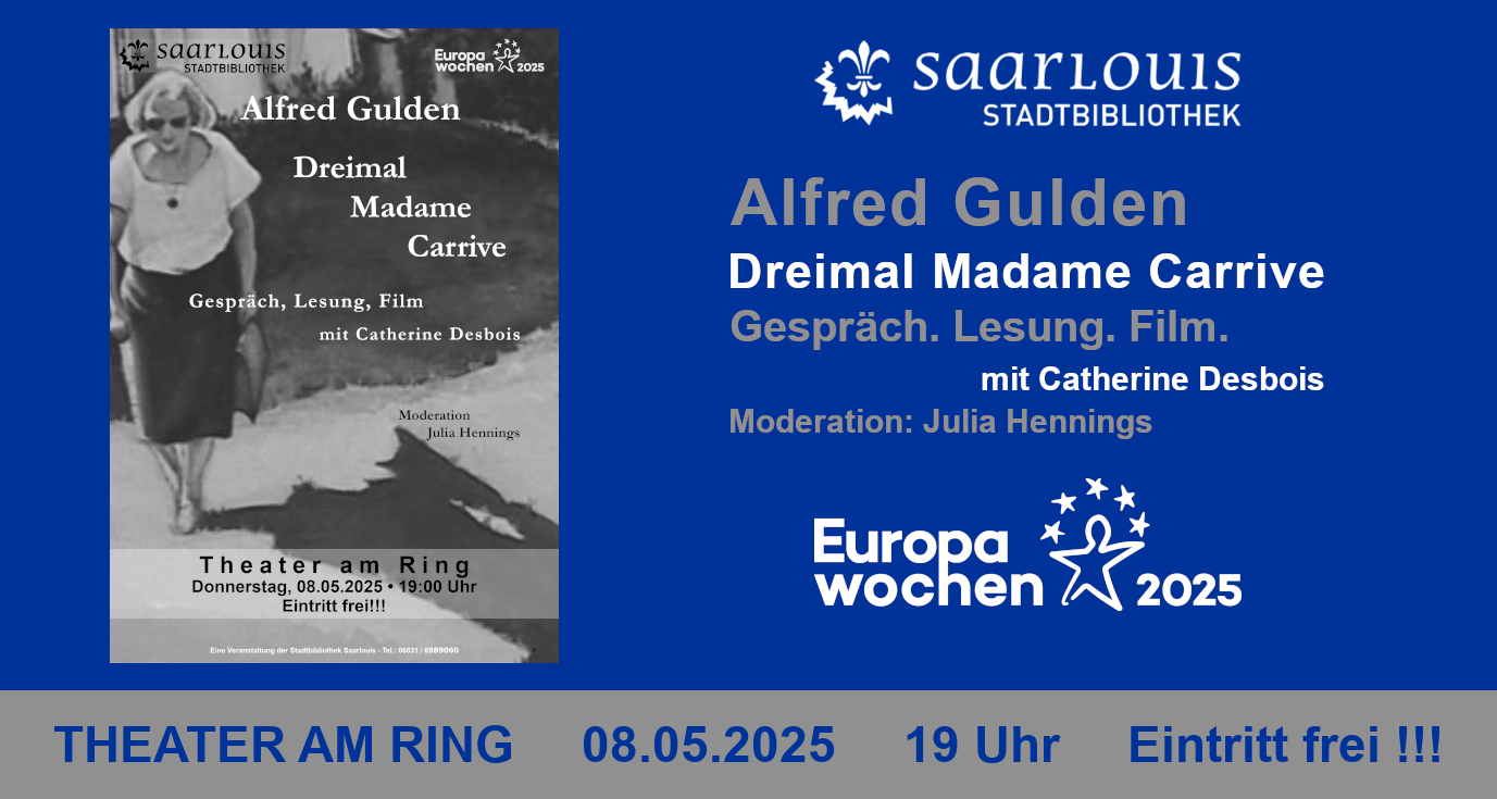 Am Donnerstag, 08. Mai 2025 um 19 Uhr, lädt die Stadtbibliothek Saarlouis zur multimedialen Veranstaltung „Dreimal Madame Carrive“ mit Alfred Gulden und seiner Übersetzerin Catherine Desbois in das Theater am Ring Saarlouis ein. Kulturamtsleiterin Julia Hennings wird die Veranstaltung moderieren. Der Titel „Dreimal Madame Carrive“ wurde deswegen gewählt, da neben den drei Akteuren und den drei Programmpunkten - Gespräch, Lesung und Film - drei Werke von Alfred Gulden im Mittelpunkt stehen, die sich alle um Madame Carrive drehen: • „Die Taschen der Madame Carrive : Geschichten aus Bordeaux und um Bordeaux herum“ (2021, Wehrhahn, Hannover) • „Glück im Unglück. Die Geschichte der Madame Carrive“ (1999, BR) • „Les sacs de Madame Carrive“ ins Französische übertragen von Catherine Desbois (2025, Editions LHarmattan, Paris) Wer war diese Madame Carrive? Charlotte Johanna Martha Carrive, als Charlotte Behrendt in Breslau geboren, starb 2002 mit 93 Jahren auf der Girarde, ihrem alten Weingut vor Bordeaux, nahe St. Emilion. Dort hatte sie fast 40 Jahre seit dem Tod ihres Mannes, dem Surrealisten Jean Carrive, dem Mitunterzeichner des „Manifeste du Surréalisme“, gelebt. Als im Dritten Reich ihre jüdische Familie wegen des Nazi-Terrors aus Deutschland emigrierte, blieb sie im besetzen Frankreich bei ihrem französischen Mann, den sie 1934 geheiratet hatte. Auf ihrem Weingut gewährten Charlotte und Jean Carrive deutschen Juden und Jüdinnen, u.a. Baladine Klossowska, Rilkes letzte große Liebe, Zuflucht. Dort erzählte Mme Carrive Ende der 1990er in langen Küchengesprächen Alfred Gulden aus ihrem bewegten Leben. „Werden Sie etwas über mich schreiben?“ Diese Frage von Madame Carrive, Alfred Gulden gestellt nach einem ihrer intensiven Gespräche, hat er lange mit sich herumgetragen. Worte, Wörter schätzte sie sehr hoch. Verständlich, ist doch das Wort, sind doch die Worte im Jüdischen von großer, ja existentieller Wichtigkeit. Sprache, das ist ein Haus, überall mitzunehmen. Sprache, das ist (heilige - siehe Thora) Heimat, leichtes Gepäck, konkret und doch das Abstrakteste. Jahre nach seinem Bordeauxaufenthalt, aus den vielen Notizen nach und während ihrer Gespräche, hat Alfred Gulden den Erzählband Die Taschen der Madame Carrive geschrieben. Ein Glück: Catherine Desbois von der Universität Metz haben die Erzählungen so gut gefallen, dass sie sie ins Französische übersetzt hat.Les sacs de Madame Carrive ist in diesen Tagen bei dem renommierten Verlag L´Harmattan in Paris erschienen. Im Gespräch mit dem Autor, moderiert von Julia Hennings, gibt sie Einblicke in ihre Arbeit. Anschließend sind einige Geschichten im Original und der Übersetzung, gelesen vom Autor und der Übersetzerin, zu hören. Glück im Unglück. Die Geschichte der Madame Carrive. Dieser Film von Alfred Gulden ist vom Bayerischen Fernsehen produziert und in der Reihe Lebenslinien gesendet worden. Es sind Linien, die an einem bestimmten Punkt eine Richtungsänderung erfahren und das Leben völlig anders bestimmen. Madame Carrive erwies sich nicht nur Kamera tauglich, sie fühlte sich wohl vor der Kamera, umgeben von einer Reihe junger Männer, die nur Sie im Auge hatten (und im Ohr), ja, sie wollte immer mehr in die technische Arbeit eingreifen, versuchte mit ihrem Stock zu dirigieren, aber mit einem Shalom, General! von Gulden, das sie lachend zur Kenntnis nahm, war sie dann wieder ganz in ihrer Rolle, in ihrer Person. Die Stadtbibliothek Saarlouis freut sich, zu diesem sicherlich unterhaltsamen und interessanten Abend einladen zu können. Die Veranstaltung im Rahmen des Programmes der Stadtbibliothek Saarlouis zu den Europawochen 2025 findet am Donnerstag, 08. Mai 2025 um 19 Uhr im Theater am Ring Saarlouis statt. Der Einlass ist um 18:30 Uhr. Der Eintritt ist frei!