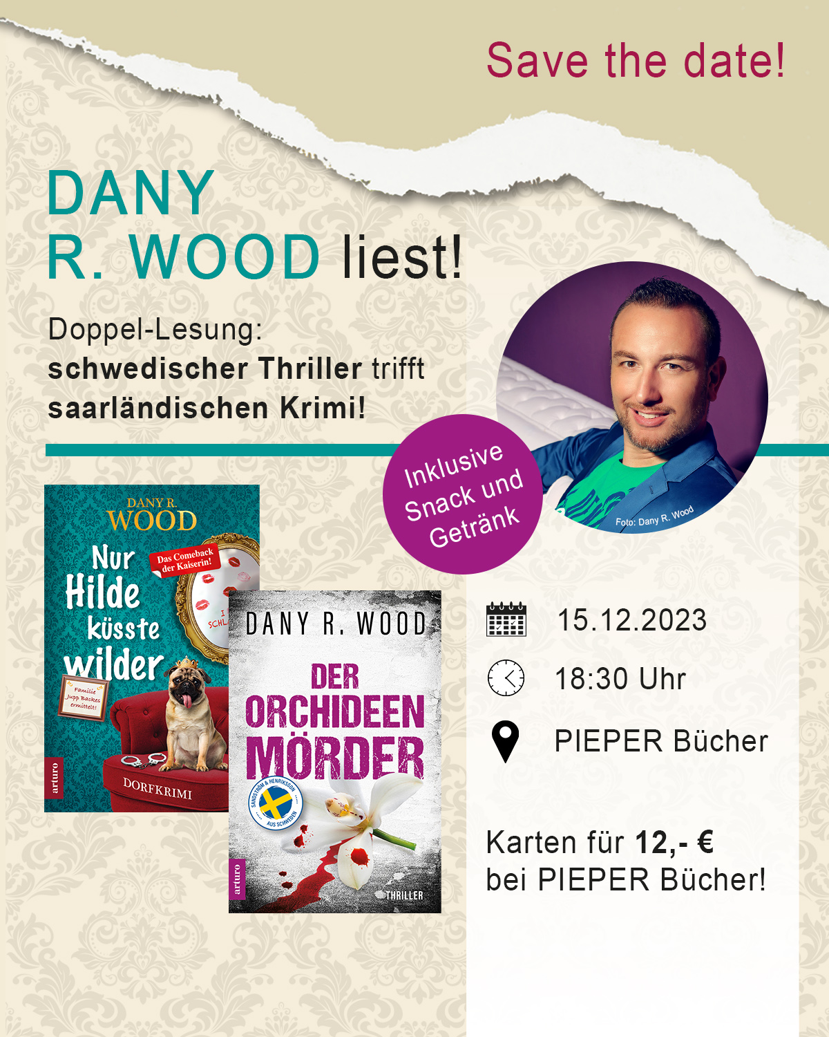 Es wird spannend‼️ Bestseller-Autor Dany R. Wood kommt zu einer Doppellesung! Er liest aus seinem neuen Schweden-Thriller "Der Orchideenmörder" sowie aus dem neuen saarländischen Dorfkrimi "Nur Hilde küsste wilder". Die Reihe um den Saar-Kommissar Jupp Backes mit inzwischen über 100.000 verkauften Exemplaren garantiert auf jeden Fall vergnügliche sowie spannende Stunden! Erlebt gemeinsam mit uns einen tollen Lese-Abend inklusive einem kleinen Snack und einem Getränk!