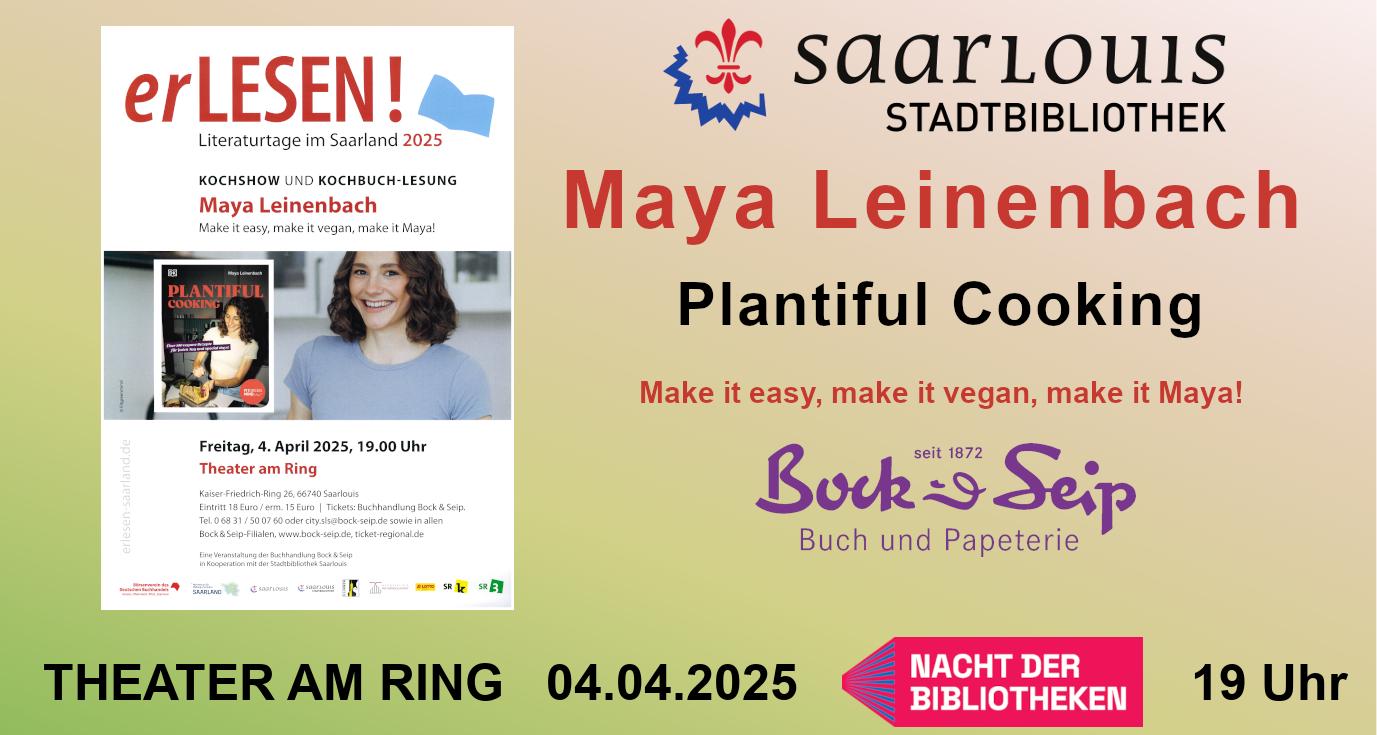 Maya Leinenbach - Plantiful Cooking - Make it easy, make it vegan, make it Maya! Kochbuchshow mit Fitgreenmind im Rahmen von erLESEN! 2025 und der bundesweiten Nacht der Bibliotheken Die Buchhandlung Bock & Seip und die Stadtbibliothek Saarlouis präsentieren im Rahmen des Literaturfestivals erLESEN! und der bundesweiten Nacht der Bibliotheken am Freitag, 04. April 2025 um 19 Uhr Maya Leinenbach aka Fitgreenmind, Deutschlands erfolgreichste vegane Foodbloggerin und Content Creator mit ihrem neuen Kochbuch „Plantiful Cooking“. Ob proteinreiches Kichererbsen-Sandwich oder vietnamesischer Banh-Xeo-Pfannkuchen mit Tofu-Kräuterfüllung: Maya begeistert Millionen von Fans mit unkomplizierten veganen Gerichten aus aller Welt. Mit 14 Jahren entschied sich Maya Leinenbach: Ich möchte jetzt vegan leben. Heute profitieren von dieser Entscheidung Millionen Menschen weltweit. Die einen, weil sie vegane Rezepte von Mayas Social Media Channels @fitgreenmind zu Hause nachkochen können; die anderen, weil mehr vegane Mahlzeiten einen positiven Effekt auf unser aller Leben haben können. Maya betreibt mit @fitgreenmind heute einen der bekanntesten und reichweitenstärksten plant-based Food Channels weltweit und begeistert mit ihren kreativen Rezepten eine riesige Online-Community. Mit fast 7 Millionen FollowerInnen auf Instagram, TikTok und YouTube inspiriert sie Menschen auf der ganzen Welt, immer öfter mal eine pflanzenbasierte Ernährung in ihren Alltag zu integrieren. Ihre Rezepte sind nicht nur lecker und alltagstauglich, sondern zeigen auch, dass eine vegane Lebensweise unkompliziert und genussvoll sein kann. Schon früh träumte sie davon, im heimischen Saarwellingen ein veganes Kochbuch zu schreiben. Mit 17 Jahren veröffentlicht sie 2021 „Ach, das ist vegan?“. Gerade ist ihr zweites Kochbuch „Plantiful Cooking“ im Dorling Kindersley Verlag erschienen. Es bietet über 100 Rezepte, die plant-based Gerichte für jede Gelegenheit bieten. Von Single Serve über Meal Prep bis hin zu aufwändigem Essen und ganzen Dinnerparties ist alles dabei. Maya wird ihr neuestes Kochbuch „Plantiful Cooking“ persönlich bei der Veranstaltung der Stadtbibliothek Saarlouis und der Buchhandlung Bock & Seip im Theater am Ring Saarlouis vorstellen und mit ihrer begeisternden Art von sich und von @fitgreenmind und ihren Erfolgen erzählen. Bei Maya wird es natürlich keine normale Lesung sein, sondern sie wird auch etwas aus ihrem neuen Buch zubereiten. Eine ganz besondere Kochbuchshow und Kochbuch-Lesung mit Maya Leinenbach. Ein Abend voller Spaß, Essen und unvergesslicher Erlebnisse. Moderiert wird die Veranstaltung von der Journalistin und Moderatorin Anne Hilt. Die Veranstaltung der Stadtbibliothek Saarlouis und der Buchhandlung Bock & Seip findet am Freitag, 04. April 2025 um 19 Uhr im Theater am Ring Saarlouis statt. Einlass ist um 18:30 Uhr. Karten zum Preis von 18 € (ermäßigt 15 €) gibt es bei der Buchhandlung Bock & Seip Saarlouis (Großer Markt 2 / 66740 Saarlouis / Tel.:06831 / 5007625) und bei den Vorverkaufsstellen von Ticket Regional. Online sind die Karten unter www.ticket-regional.de erhältlich.