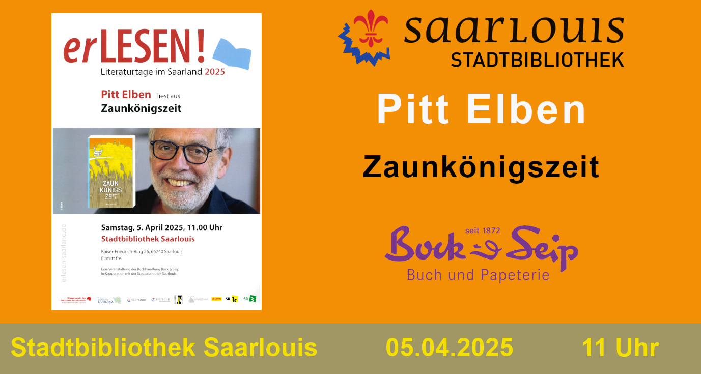 Zaunkönigszeit“ : Lesung mit Pitt Elben in der Stadtbibliothek Saarlouis im Rahmen des Literaturfestivals erLESEN! Wer sich auf eine bittersüße Zeitreise begeben möchte, kommt in dieser Lesung der Stadtbibliothek Saarlouis und der Buchhandlung Bock & Seip im Rahmen des Literaturfestivals erLESEN! auf seine Kosten. Der Debütroman „Zaunkönigszeit“ von Pitt Elben entführt uns zurück in die 1960er Jahre. Das Buch spielt in der Eifel, könnte aber auch im Saarland der 60er spielen. Es geht um den schleichenden Verlust von Heimat: Mitte der 60-er Jahre fräst sich die spätere A 48 ins Gelände; eine Schilfaue muss Bauplätzen weichen; das bäuerliche Zaunheim mutiert zum Vorort einer Großstadt. Rasch wechselnde Erzählperspektiven vermitteln Tempo, vor allem die Kinderbande der Marsmännchen sorgt für Überraschungen und Lesespaß. Elbens Sprache ist schlicht aber kraftvoll, die Personen sind einfühlsam charakterisiert, viele Facetten des Alltagslebens sind farbig und plastisch beschrieben. Der Autor Pitt Elben wird in einer szenischen Lesung Episoden sein Buch „Zaunkönigszeit“ präsentieren. Mit der Lesung wird auch die Ausstellung „Kindheit & Jugend in den 60ern: Zeitreise in 50 Anekdoten“, die der Autor mit Lesern und Leserinnen seines Werkes entwickelt hat, in der Stadtbibliothek Saarlouis eröffnet. Pitt Elben wird aus seinem Roman „Zaunkönigszeit“ am Samstag 5. April 2025 um 11 Uhr in den Räumen der Stadtbibliothek Saarlouis im Theater am Ring lesen. Zur Lesung im Rahmen des Literaturfestivals erLESEN! laden die Buchhandlung Bock & Seip und die Stadtbibliothek Saarlouis bei freiem Eintritt ein.