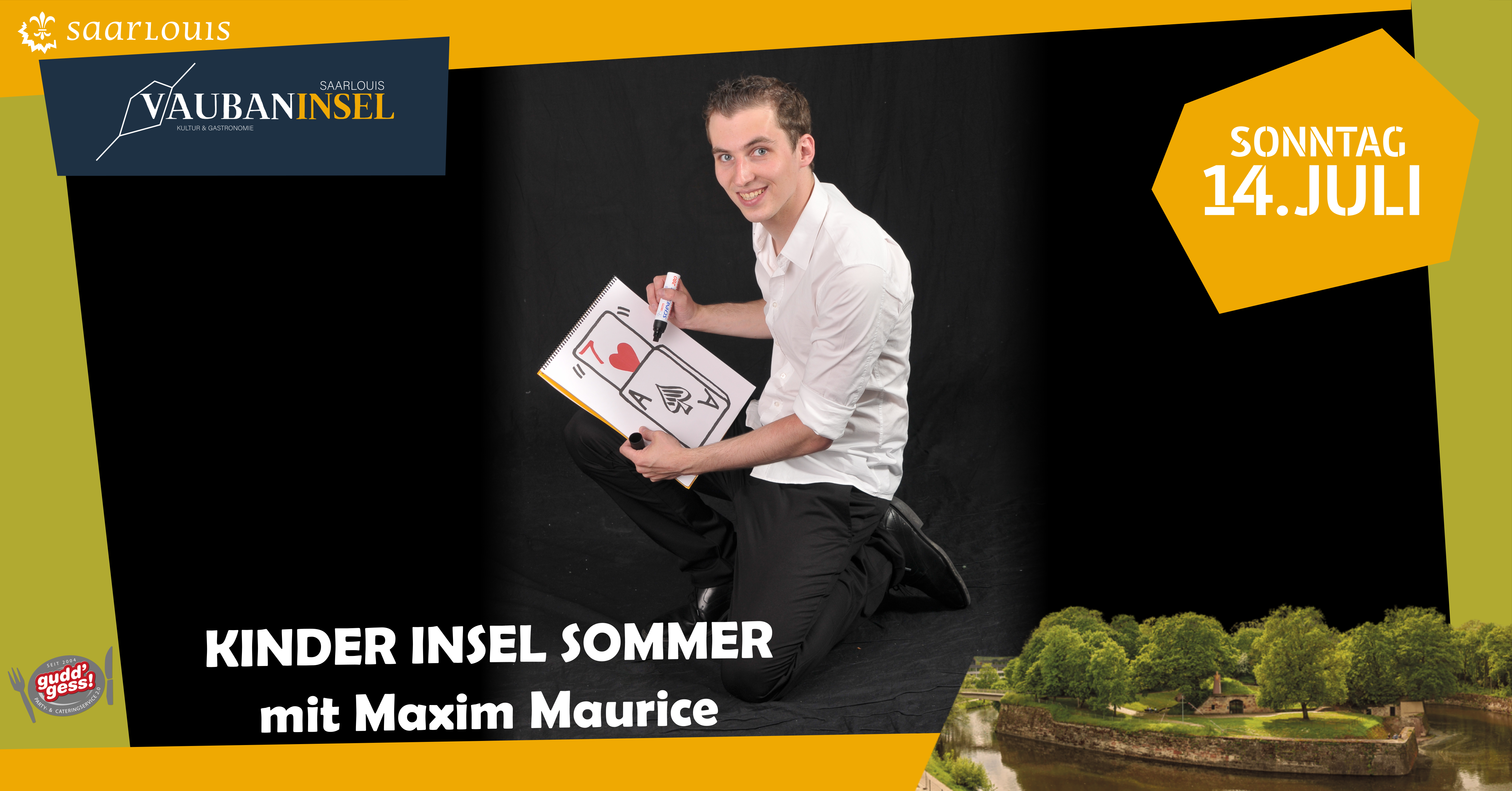 Der beliebte Zauberkünstler Maxim Maurice lässt am 14. Juli, 11:00 Uhr auf der Vauban Insel in seiner Heimatstadt Saarlouis Gegenstände verschwinden und erscheinen, Tische schweben und Flaschen sich scheinbar endlos vermehren. Der Magier präsentiert in seiner Kinderzaubershow außerdem seine persönliche Sockensammlung, die plötzlich zum Requisit wird.