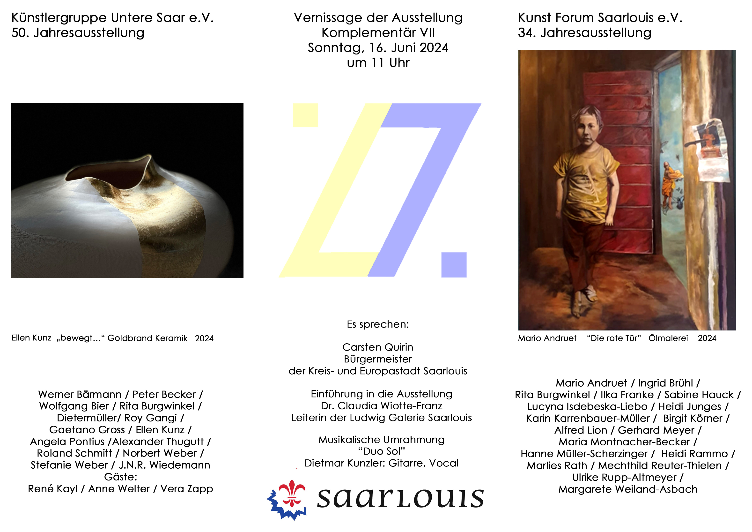 Unter dem Titel „Komplementär VII“ werden auch 2024 in der Ludwig Galerie Saarlouis die beiden Jahresausstellungen der Künstlergruppe Untere Saar e.V. und des Kunst Forums Saarlouis e.V. präsentiert. Die Ausstellung gewährt überraschende Einblicke und neue Möglichkeiten, das Spektrum der Saarlouiser Künstlergruppen im gemeinsamen Austausch kennenzulernen.
