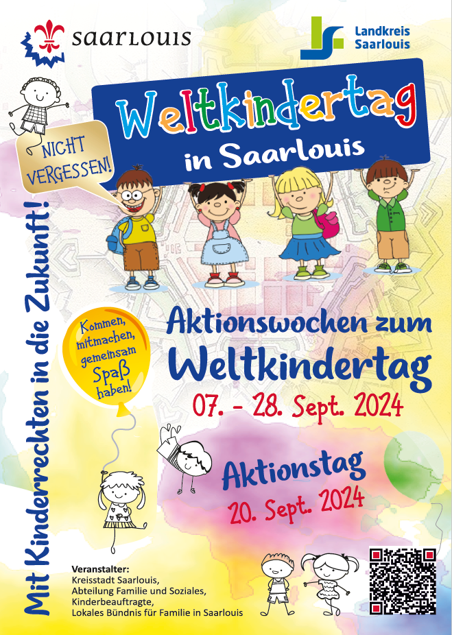 Viele Engagierte aus Saarlouiser Institutionen, Verbänden, Vereinen und Interessensgruppen sowie dem „Lokalen Bündnis für Familie Saarlouis“ haben gemeinsam mit der städtischen Kinderbeauftragten ein informatives, buntes Programm mit mehr als 25 Angeboten zusammengestellt. Ziel ist es sich für Kinder, ihre Rechte, Ideen, Wünsche und Interessen stark zu machen, aber auch kleinen und großen Leuten Freude zu vermitteln. Mit Nachhaltigkeit werden die vielfältigen Aktionen zum Weltkindertag sicherlich weiterhin in Saarlouis und darüber hinaus in der Gesellschaft wirken. Die Organisatoren in Saarlouis laden herzlich zur aktiven Teilnahme ein und wollen Denkanstöße für die Zukunft und zur Wahrung der Kinderrechte geben. Der Landkreis Saarlouis unterstützt und bezuschusst diese Aktionen wohlwollend.