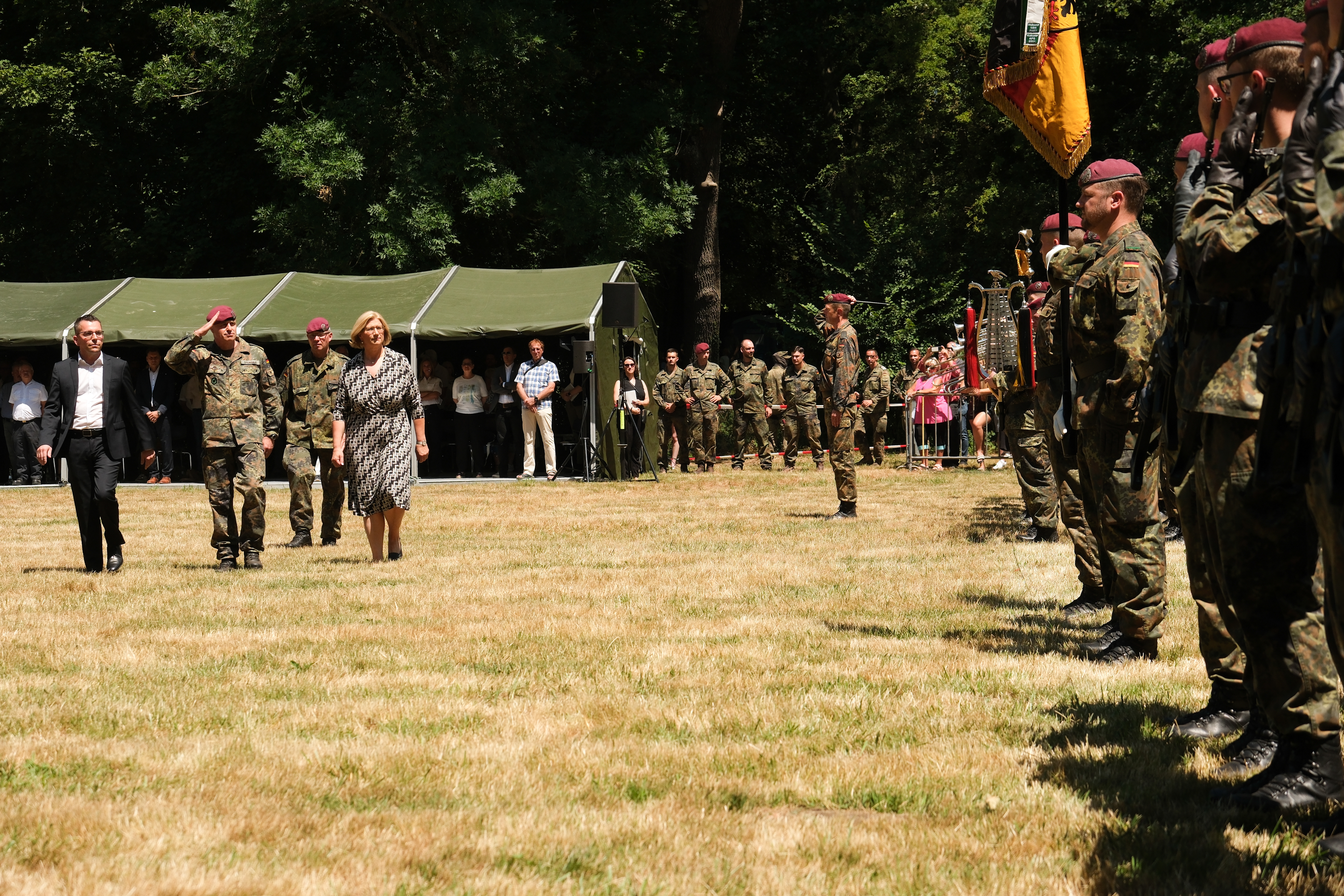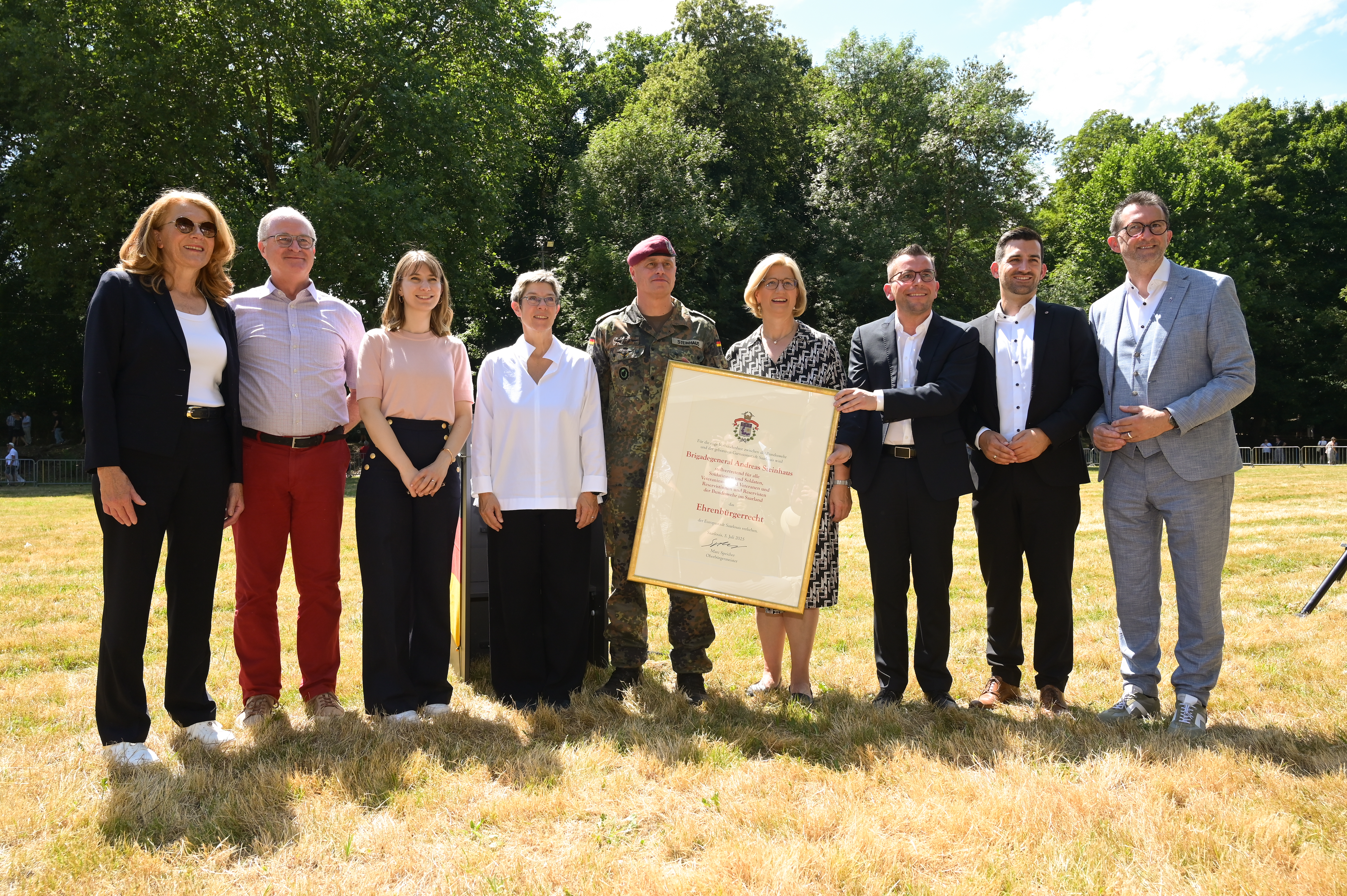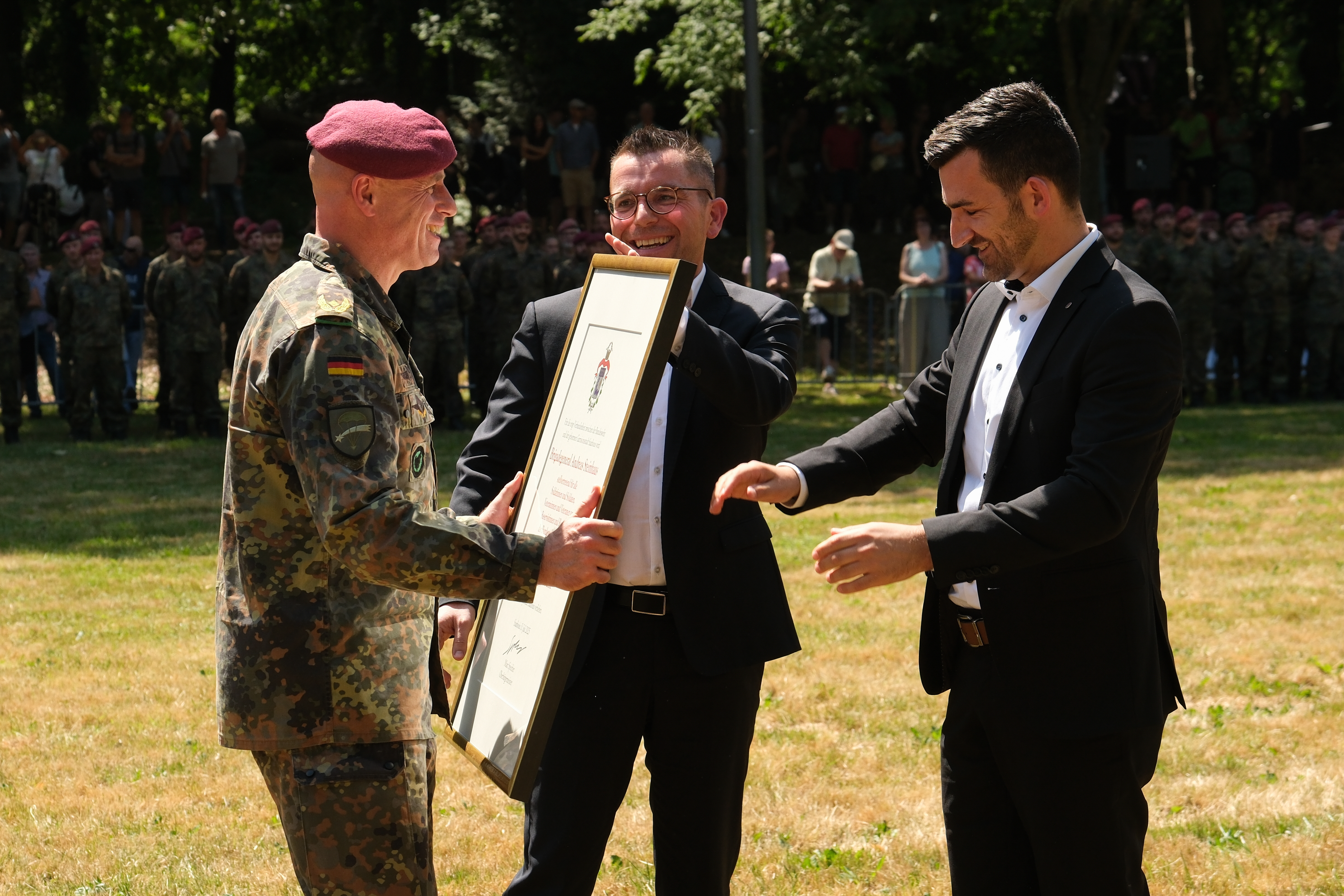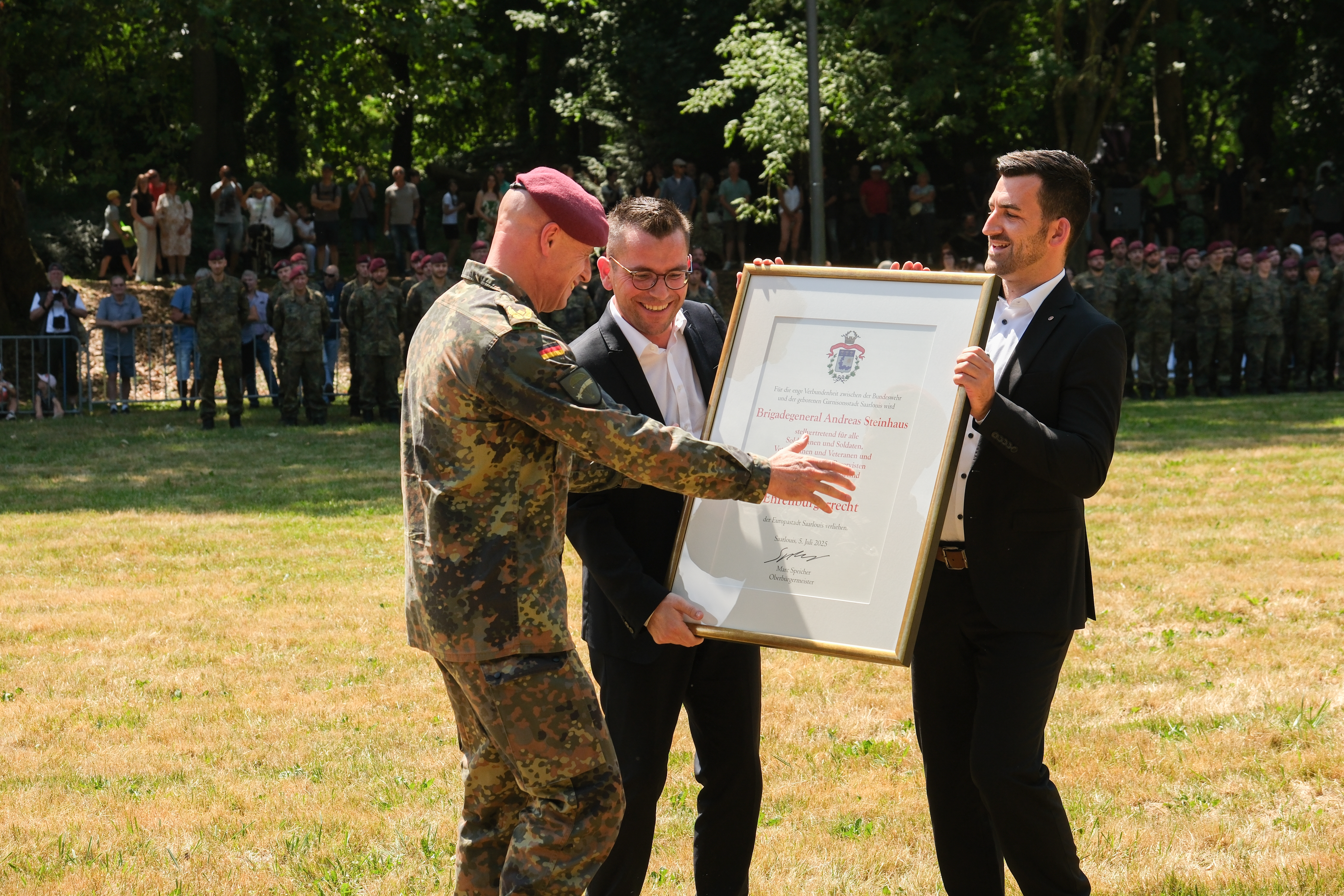 Oberbürgermeister Speicher hob die besondere historische Bedeutung der „geborenen Garnisonsstadt“ Saarlouis hervor und betonte: „Die enge Verbindung zwischen Bundeswehr und Zivilbevölkerung liegt sozusagen in unserer DNA. Die Bundeswehr ist ein elementarer Teil unserer Stadt!“ Gerade in Zeiten der Bedrohung der freiheitlich-demokratischen Grundordnung brauche es die Bundeswehr, um diese nach außen hin verteidigen zu können. Er begrüßte den Konsens zur Notwendigkeit einer ausreichenden Ausrüstung der Einheit und würdigte „das professionelle Können, die Kreativität, Loyalität und die Bereitschaft zum Dienst“ jedes einzelnen Soldaten mit Worten des ehemaligen Parlamentarischen Staatssekretärs Peter Tauber. OB Speicher bedankte sich herzlich bei allen, die zum Gelingen der großartigen Feierlichkeiten beigetragen haben. „Ich persönlich bin stolz auf unsere Armee. Ja, ganz Saarlouis ist stolz auf unsere Bundeswehr“, sagte der Oberbürgermeister. Die Verleihung der Ehrenbürgerschaft an Brigadegeneral Steinhaus verdeutlicht die tiefe Anerkennung und Wertschätzung der Leistungen aller Soldaten, Veteranen und Reservisten im Dienst von Bundeswehr, Vaterland und Gesellschaft.