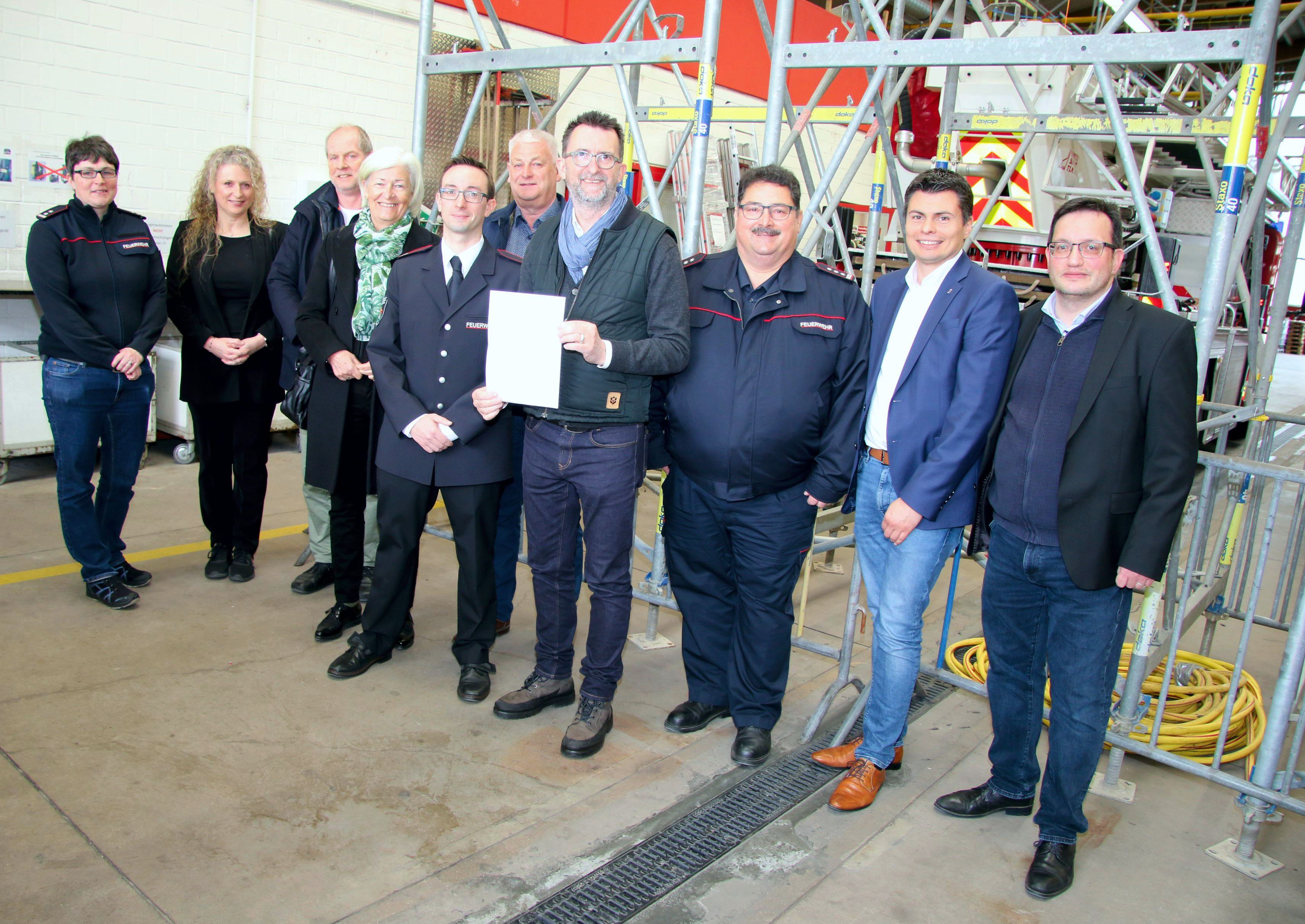 Minister Reinhold Jost bei der Überreichung des Zuwendungsbescheides in der Feuerwache Innenstadt. Mit dabei u. a. die Saarlouiser Verwaltungsspitze, Wehrführer Knut Kempeni und MdL Florian Schäfer. Fotos: Petra Molitor