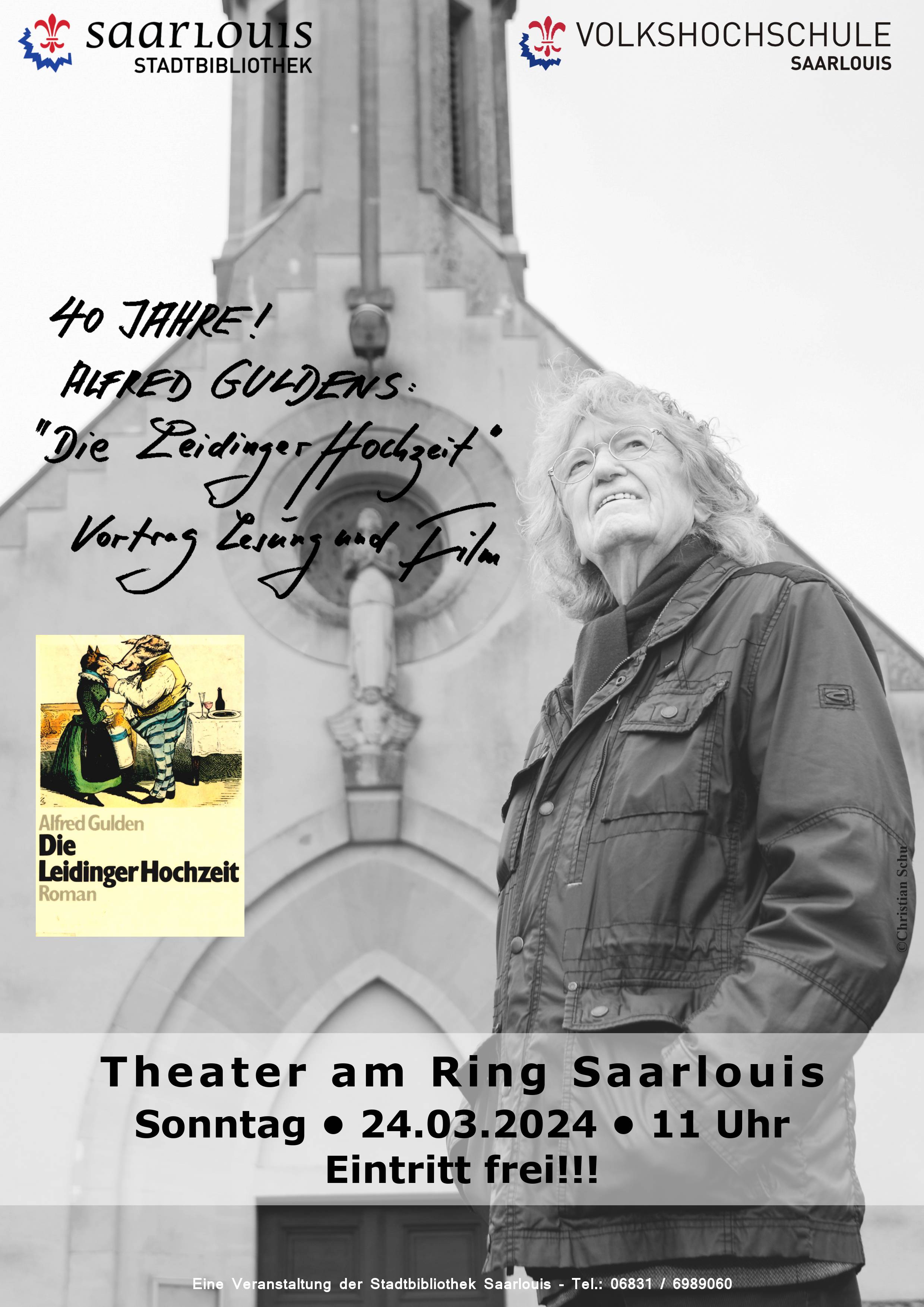 Die Matinée 40 Jahre Alfred Guldens Roman "Die Leidinger Hochzeit", eine Kooperation der Stadtbibliothek Saarlouis und der Vhs Saarlouis findet bei freiem Eintritt am Sonntag, 24. März 2024 um 11:00 Uhr im Festsaal des Theater am Ring Saarlouis statt.