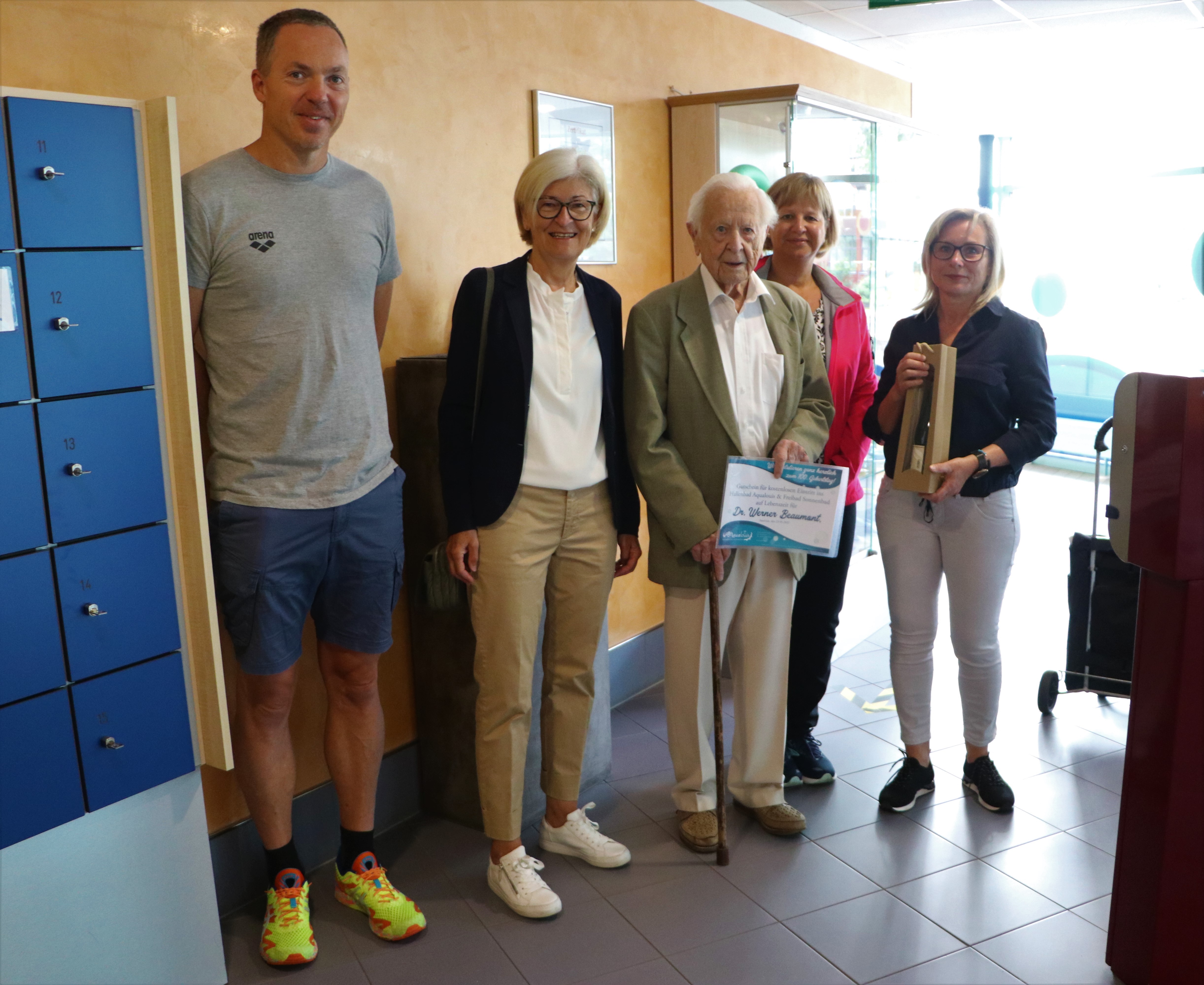 Ein ganz besonderes Jubiläum ehrten in der vergangenen Woche die Mitarbeiter des Aqualouis zusammen mit Bürgermeisterin Marion Jost. Werner Beaumont, ein Stammgast im Saarlouiser Hallenbad, feierte seinen 100. Geburtstag.