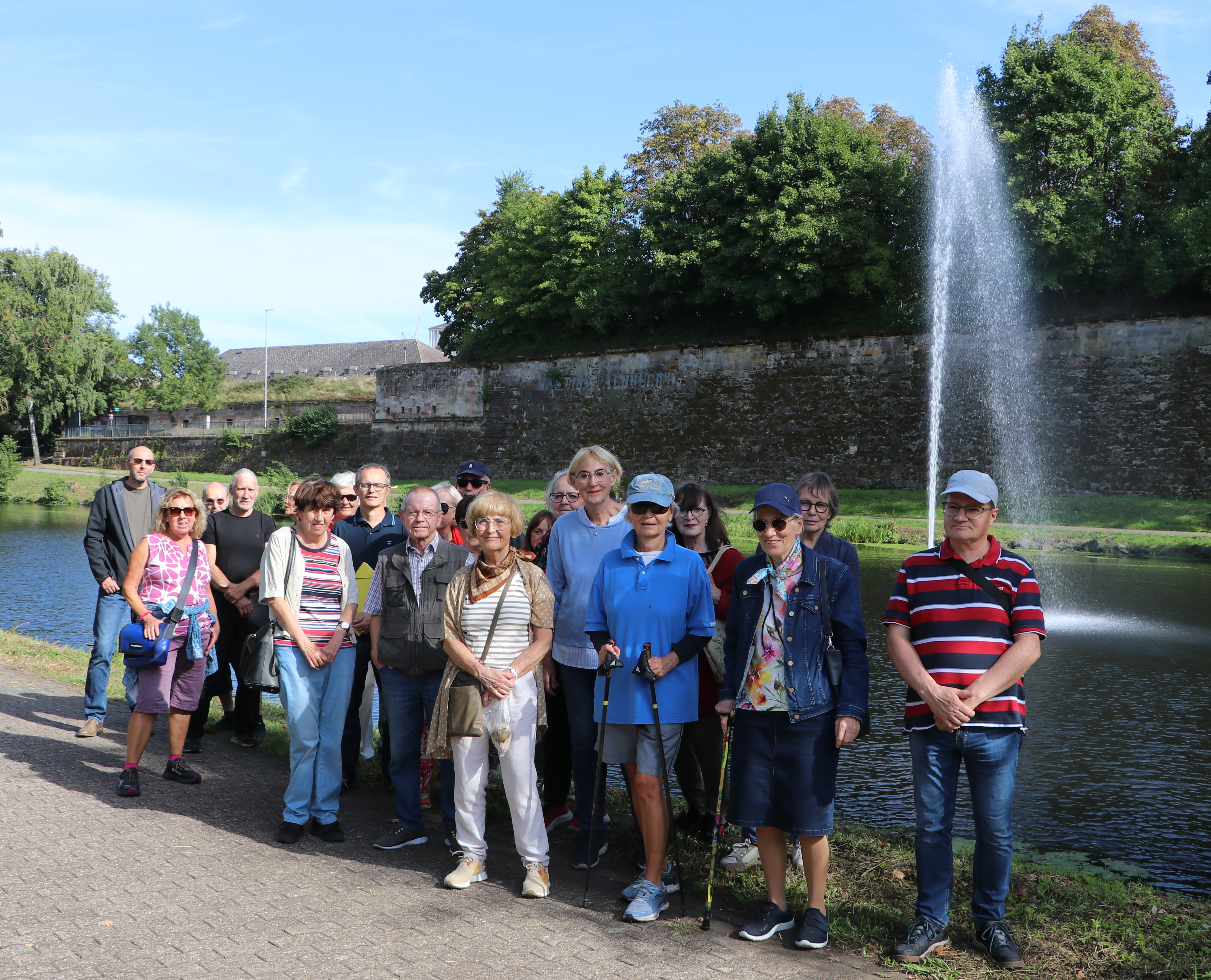 Dr. Ney gab zudem einen Überblick über zahlreiche Baumarten wie Buche, Ahorn oder fremdländische Arten, die man aus heutiger ökologischer Sicht eher nicht mehr pflanzen würde. Ebenso wie Naturschutzkonzepte im Wandel der Zeit sichtbar werden, lassen auch die imposanten Festungsmauern die Stadtgeschichte erleben, die an Wallgraben und Saaraltarm Teil der Parkanlage sind. Besonders an heißen Sommertagen sind die Mauern Lebensraum zahlreicher Eidechsen, die Dr. Ney mit der Gruppe beobachten konnte. Der Umweltschutzbeauftragte betonte die klimatische Funktion des Areals: An heißen Sommertagen liegen die Temperaturen dort deutlich unter denen der Innenstadt. 2022 erhielt der Saaraltarm eine zweite Wasserfontaine, die den Sauerstoffgehalt für Fische verbessert. Auch die Strömung wirkt der Ausbreitung von Wasserlinsen positiv entgegen.