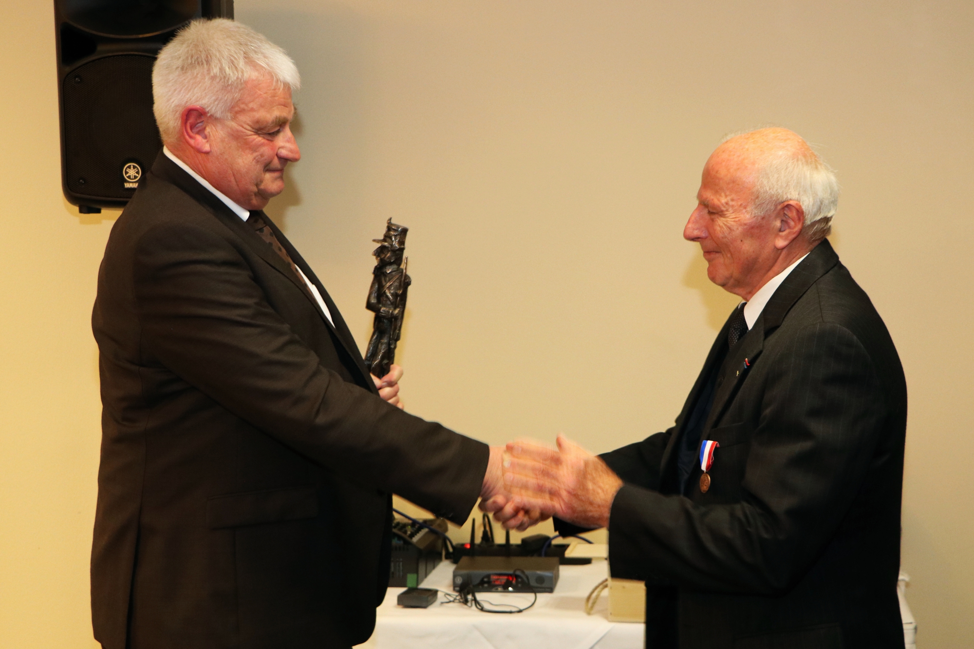 OB Peter Demmer überreichte Michel Bouchon eine Bronze-Miniatur des Soldaten Lacroix.