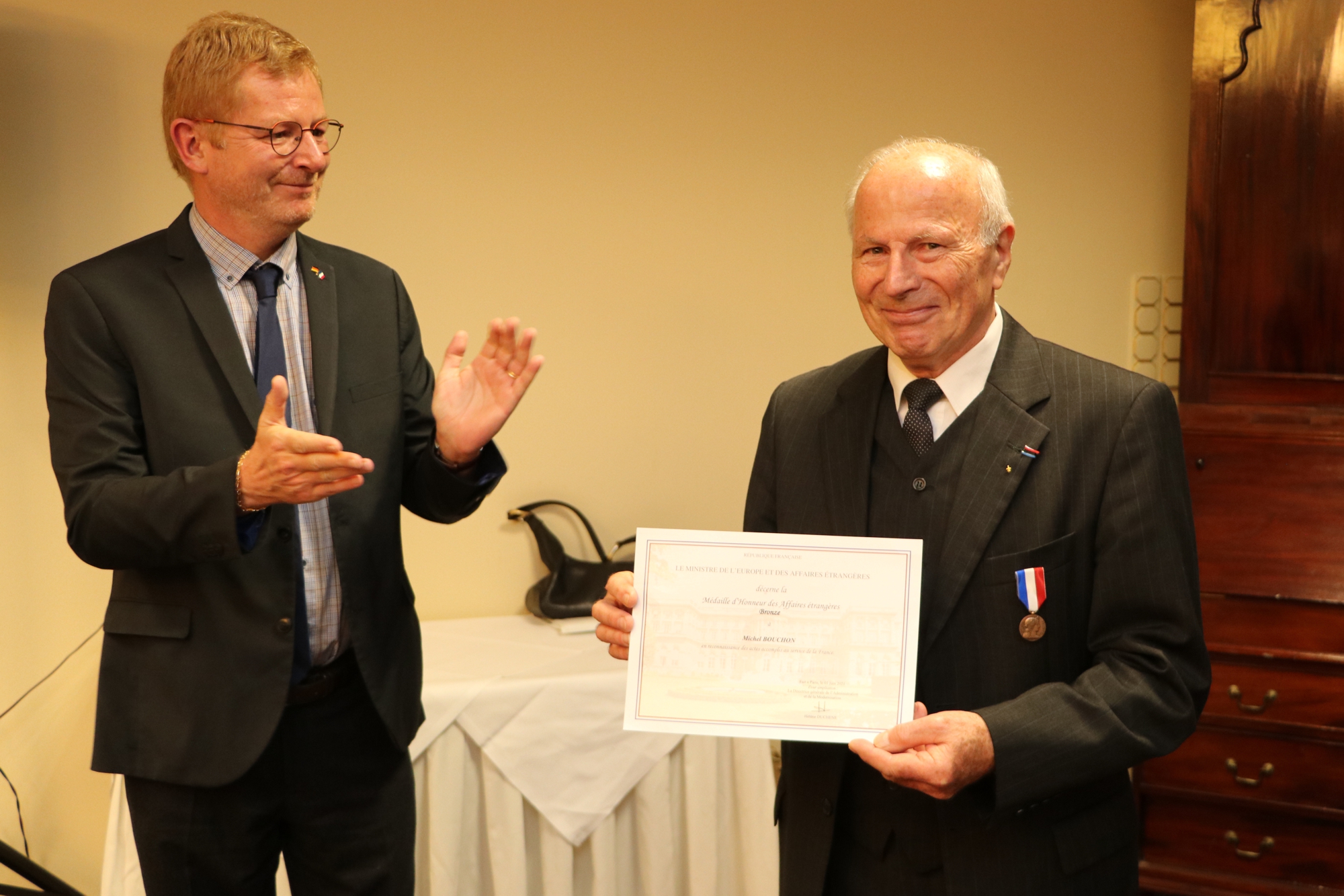 Große Ehre für Michel Bouchon: Für seine Verdienste als Honorarkonsul erhielt er die „Médaille d’Honneur des Affaires étrangères“. Diese Ehrenmedaille für auswärtige Angelegenheiten wird vom französischen Außenminister verliehen, überreicht wurde sie durch Generalkonsul Sébastien Girard. Bouchon war von 2009 bis 2017 französischer Honorarkonsul für die Landkreise Saarlouis und Merzig-Wadern. Nach seinem Ausscheiden übernahm seine Tochter Myriam Bouchon das Ehrenamt. Bis heute unterstützt Michel Bouchon sie bei ihrer Tätigkeit und hilft Franzosen in Deutschland bei konsularischen Angelegenheiten.