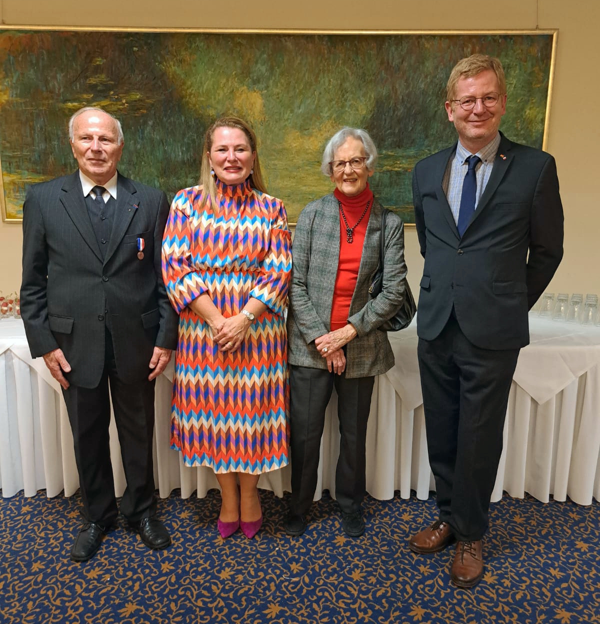 Vier Konsuln auf einem Bild (von links): Honorarkonsul a.D., Michel Bouchon, mit seiner Tochter und amtierenden Honorarkonsulin Myriam Bouchon. Daneben Odile Villeroy de Galhau, die das Ehrenamt zuvor bekleidete und als Honorarkonsulin auf ihren Schwiegervater folgte, auf dessen Bestreben die Agence Consulaire für die Landkreise Saarlouis und Merzig-Wadern gegründet wurde. Rechts der amtierende französische Generalkonsul Sébasiten Girard. Foto: Matthias Schierpke